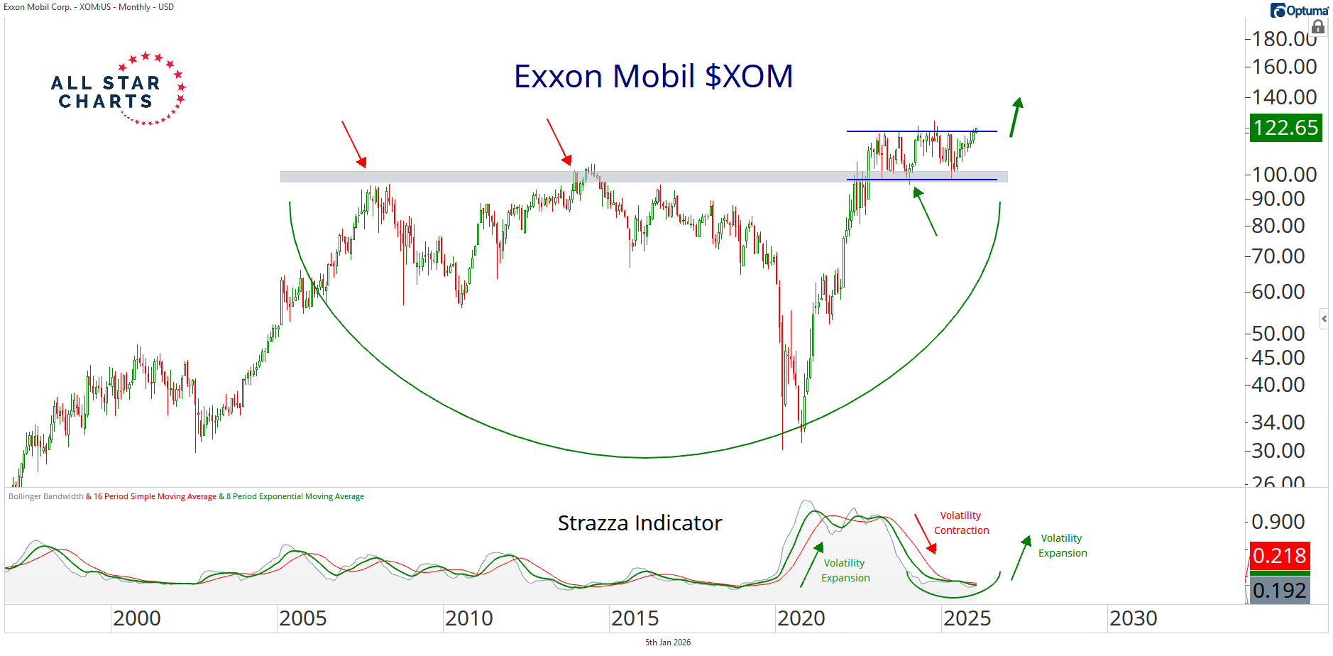 Volatility has compressed to multi-year lows on the monthly Strazza Indicator, while momentum continues to improve. That combination tends to precede fast, aggressive moves.