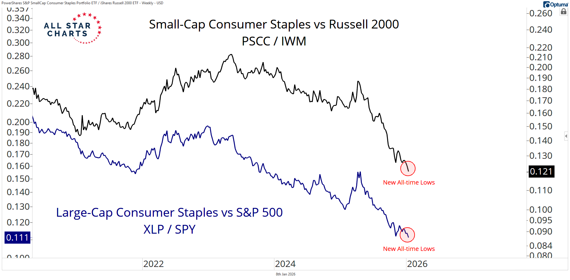 This Is Why I’m Still Bullish By Alfonso De Pablos, CMT January 8, 2026 Today, I’ll keep it simple.From where I’m sitting, this is still very much a risk-on market.The sectors that typically perform well during “risk-off” environments are the first to lag—and that’s exactly what we’re seeing now.The rotation out of defensive stocks continues to persist, showing up across the board.Even Small-Cap Consumer Staples are hitting new all-time lows relative to the Russell 2000. Seeing these two lines break down like this is about as bullish as it gets.Investors are embracing risk, not seeking safety.The bull market remains intact, and my focus continues to be finding stocks to buy, not looking for ones to sell.I’ll be diving deeper into this theme on Saturday morning at 11:30 AM during the Chart Summit 2026.The best in the business will be there—JC Parets, Steve Strazza, and other legends like Ryan Detrick, Frank Cappelleri, and Katie Stockton.Secure your spot here!Alfonso De Pablos, CMTDirector of Research, All Star ChartsSign up for my free daily note here. Alfonso's Daily Note Alfonso De Pablos highlights the day’s most important market-moving chart. More from Alfonso's Daily Note Alfonso De Pablos, CMT All-Time Highs Everywhere You Look January 7, 2026 Alfonso De Pablos, CMT The EM Catch-Up Trade January 6, 2026 Alfonso De Pablos, CMT Energy: The Best Trade in 2026 January 5, 2026 See the Chart That MattersAlfonso’s Chart of the Day highlights the setups and inflection points shaping the next big market moves — before they hit the headlines. You must have JavaScript enabled to use this form. Email Address