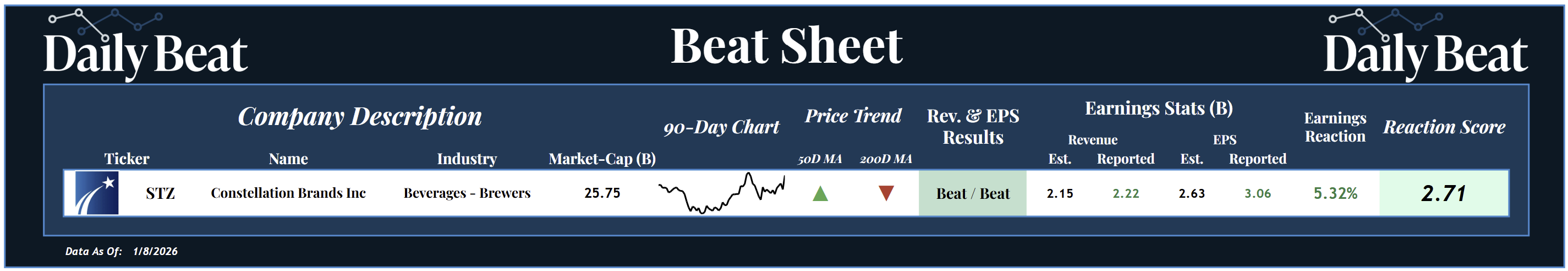 After Wednesday's closing bell, we heard from the $26B alcoholic beverage producer, Constellation Brands $STZ. Following a big double beat, shareholders were rewarded with a +2.71 reaction score.