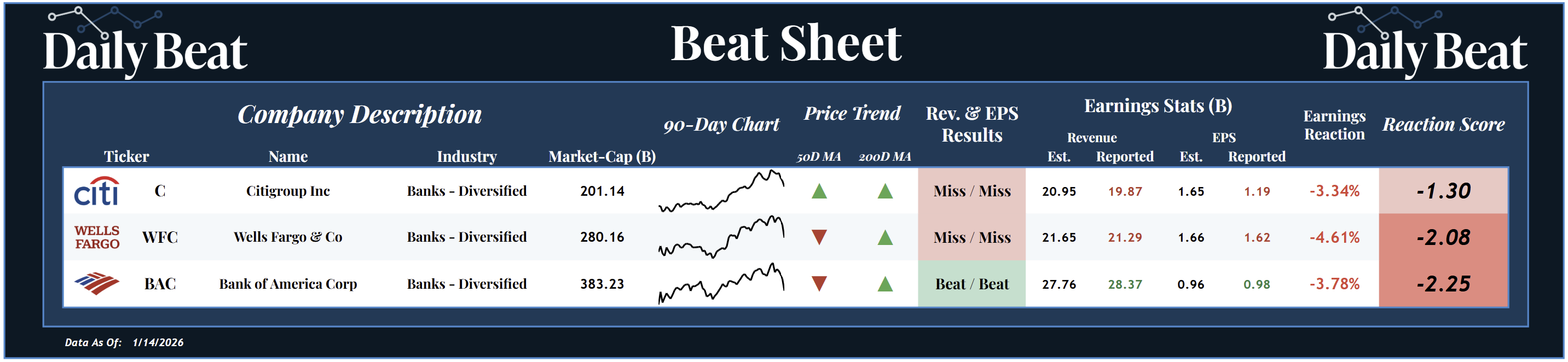 At the bottom of Wednesday's Beat Sheet was the $383B bank, Bank of America $BAC. After beating headline expectations, shareholders suffered a -2.25 reaction score.