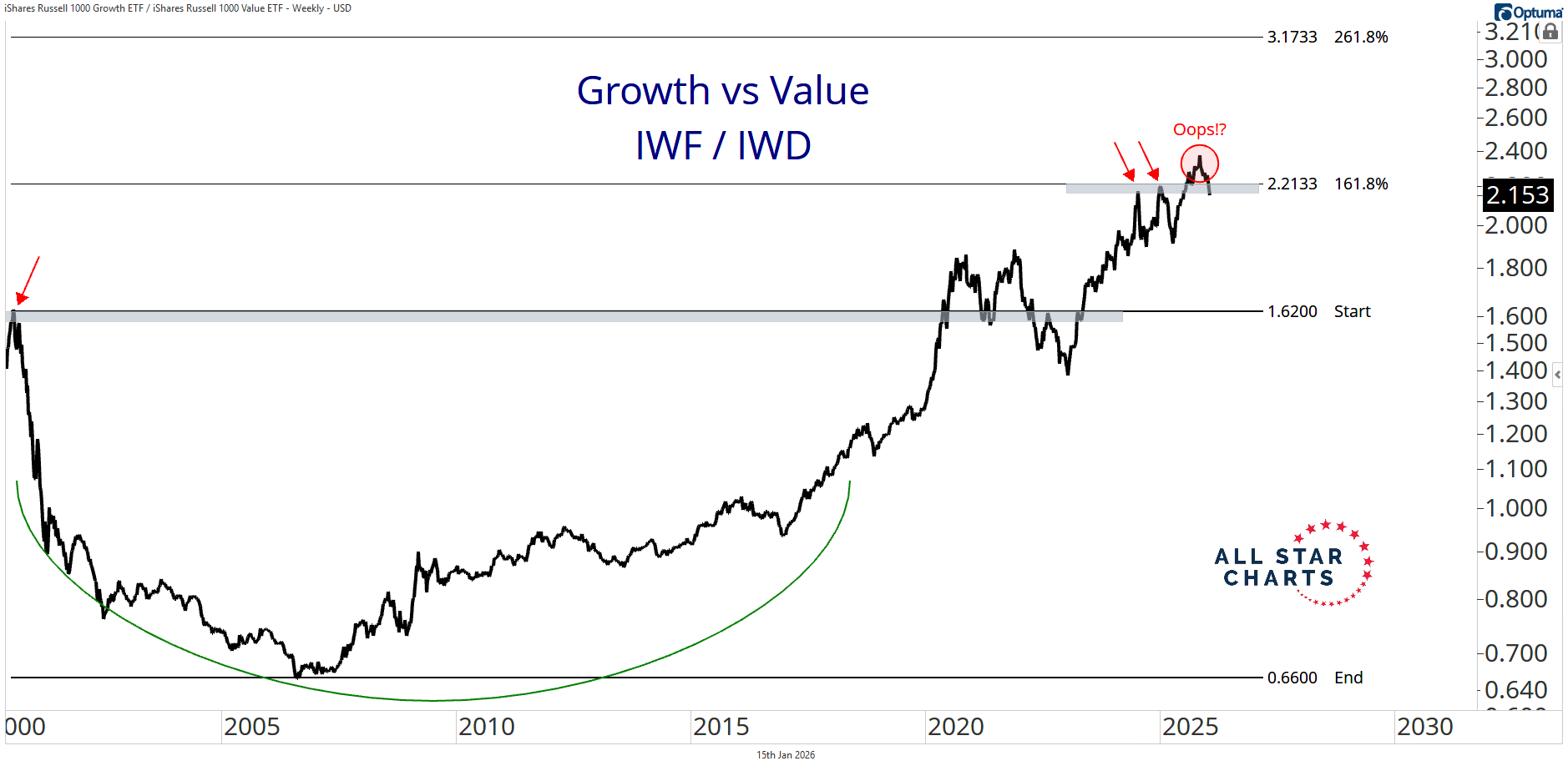 Right now, that ratio is hitting a brick wall at its dot-com bubble high, making this area a critical inflection point.