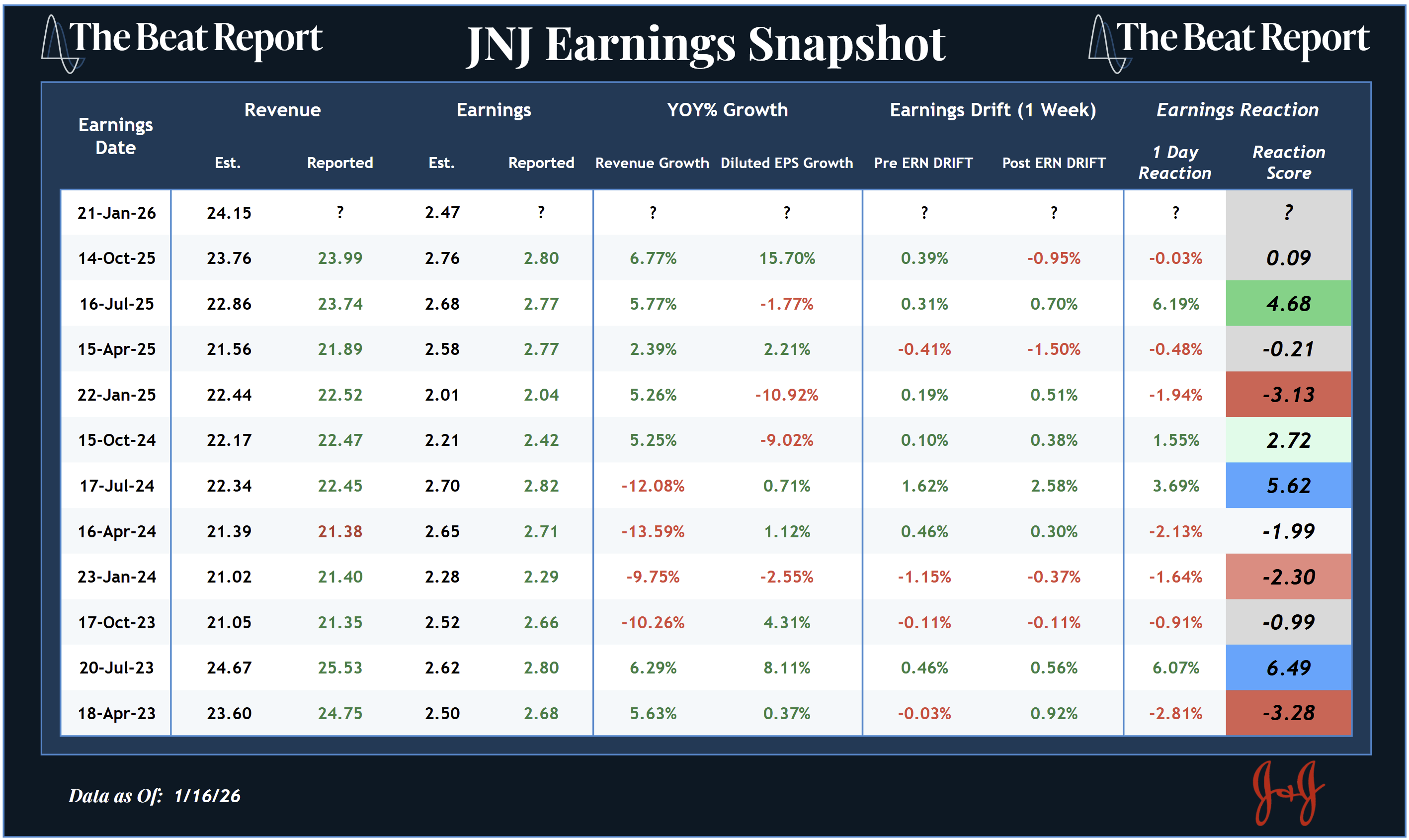 With JNJ trading at all-time highs and trend, momentum, and relative strength all aligned, the odds favor a constructive reaction if the company clears the bar.