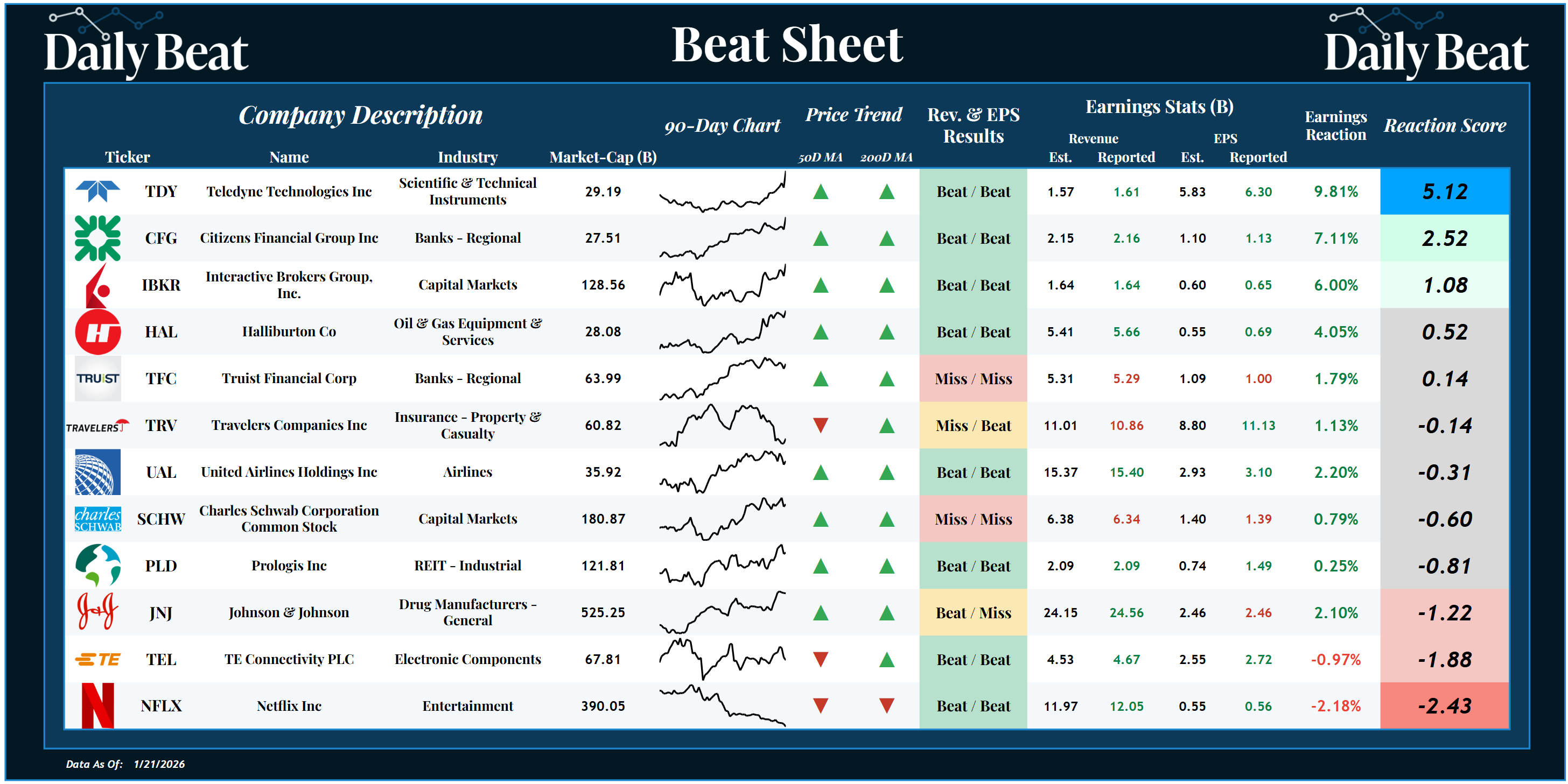At the top of the list was the $29B scientific & technical instruments stock, Teledyne Tech. $TDY. Following a big double beat, shareholders were rewarded with a +5.12 reaction score.