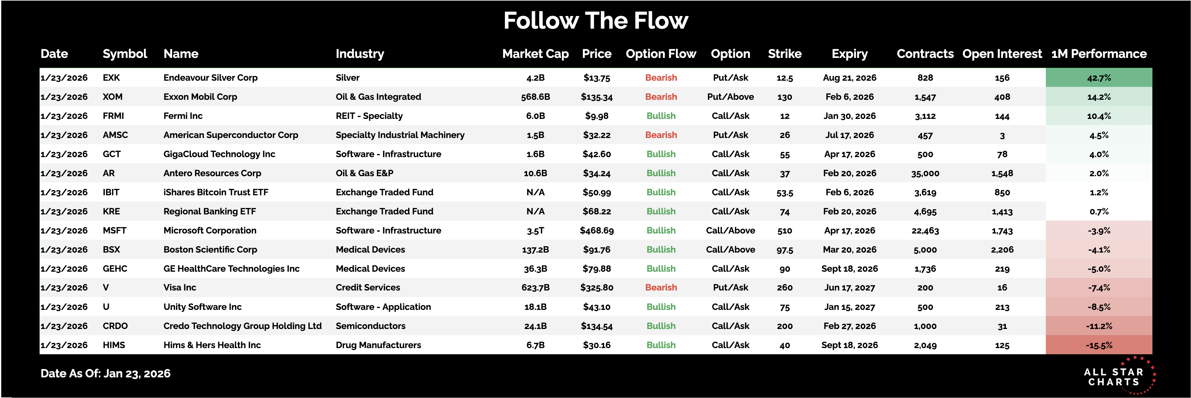 Follow the Flow By Steve Strazza January 23, 2026 This note highlights a select group of stocks showing the most unusual — and highly directional — options activity.The goal is simple: follow the big money and trade in the direction of the underlying trend.Here is the list of Unusual Options activity from January 23: *Click to enlarge viewEndeavour Silver Corp $EXK - Silver and miners have been on fire, and one trader is betting on a near-term pullback.They purchased 828 contracts of the 8/21 $12.5 puts. With the strike only 10% away, the trade doesn’t require a big move to pay off.Microsoft Corp $MSFT - Sentiment toward software is near historic lows, but one trader isn’t buying that narrative.They bought 22,463 contracts of the 4/17 $510 calls, a standout trade both in size and timing, with MSFT near key levels from its 2024 highs.Antero Resources Corp $AR - The largest trade of the day came in energy, anticipating continued near-term strength.One buyer picked up 35,000 contracts of the 2/20 $37 calls. Transactions of this size are rare and worth noting closely.