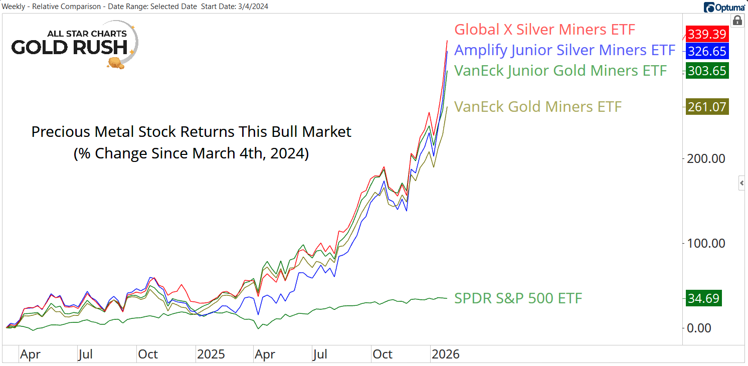 Since Gold broke out of its multi-decade base on March 4, 2024, the returns in precious metal stocks have moved from impressive to historic.