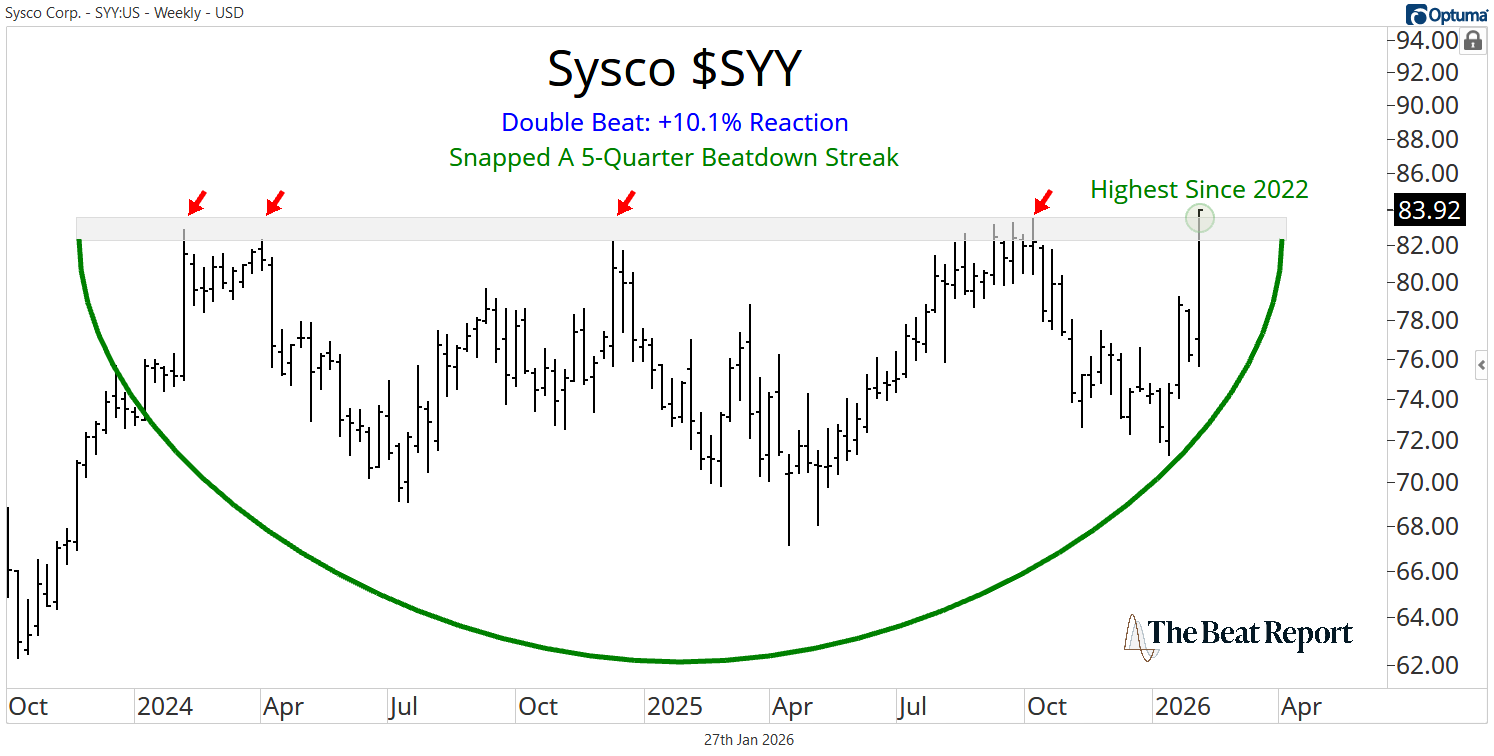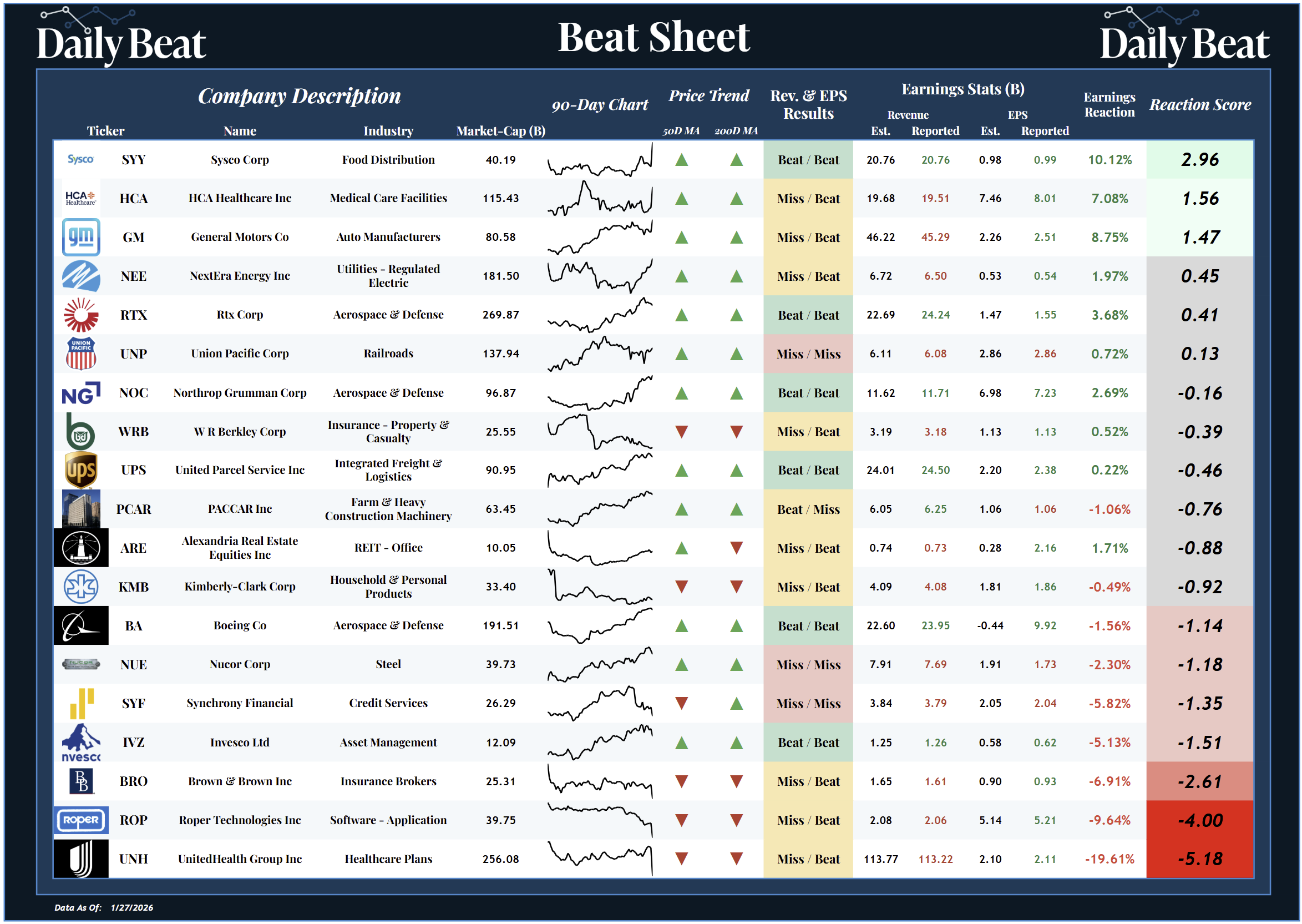 At the top of Tuesday's Beat Sheet was the $40B food distribution stock, Sysco $SYY. After beating headline expectations across the board, shareholders were rewarded with a +2.96 reaction score.