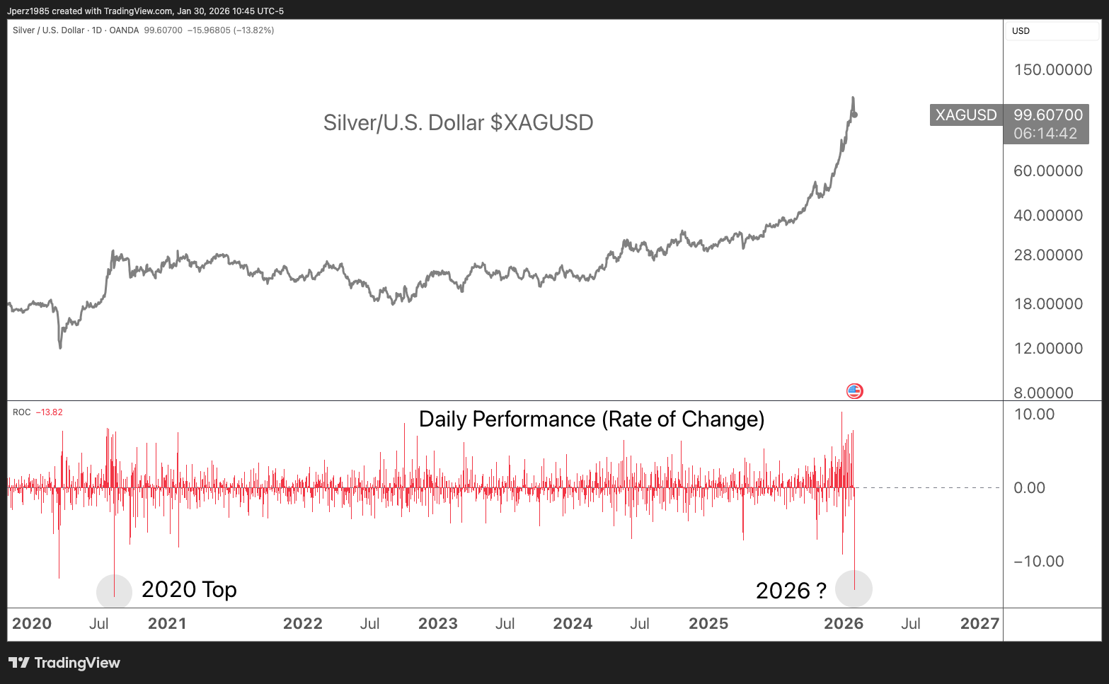 Momentum is rolling. The daily rate of change is flashing something we haven’t seen since the last major peak. If silver closes down here, this would represent a shift in character, not just a pullback.