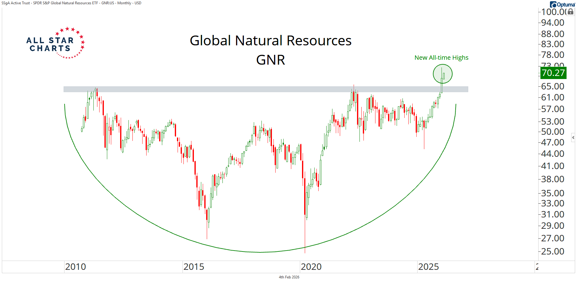 Here’s the Global Natural Resources ETF $GNR resolving higher from a massive, decade-long base: