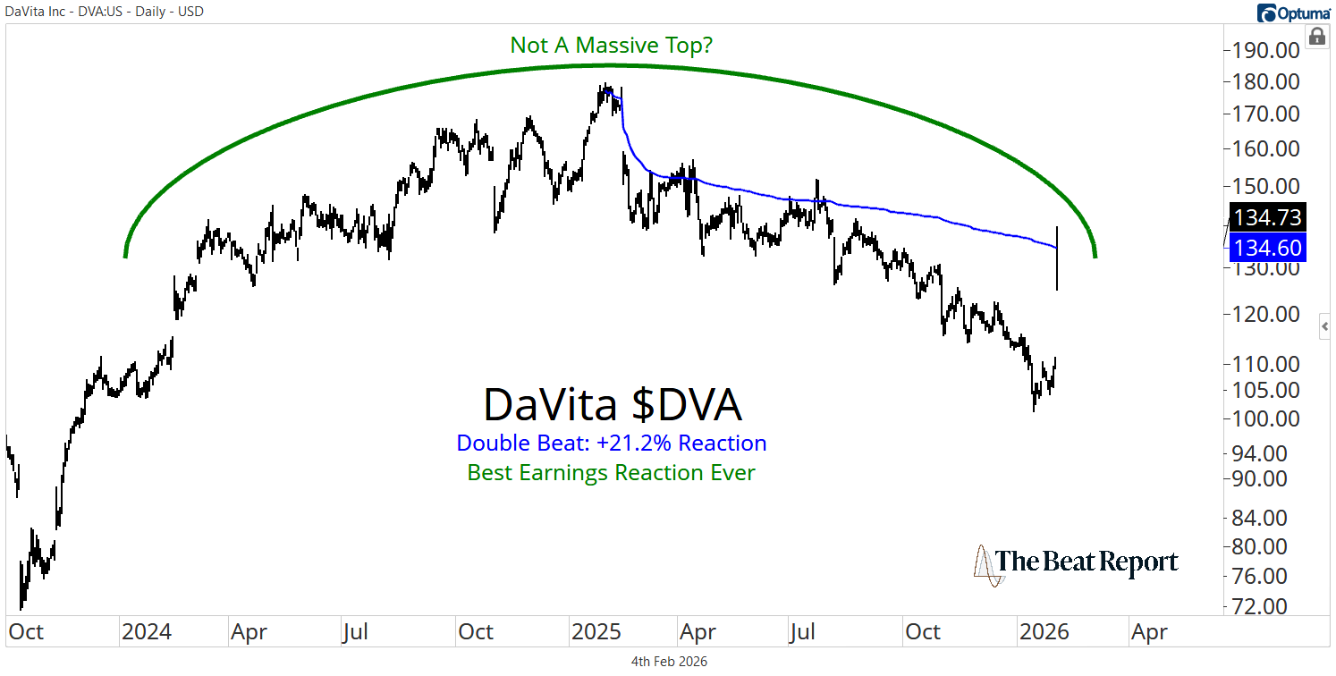 Tuesday's top beat came from the $9.6B dialysis services provider, DaVita $DVA. After crushing expectations across the board, shareholders were rewarded with a remarkable +9.76 reaction score. This was one of the highest reaction scores we've seen all earnings season.