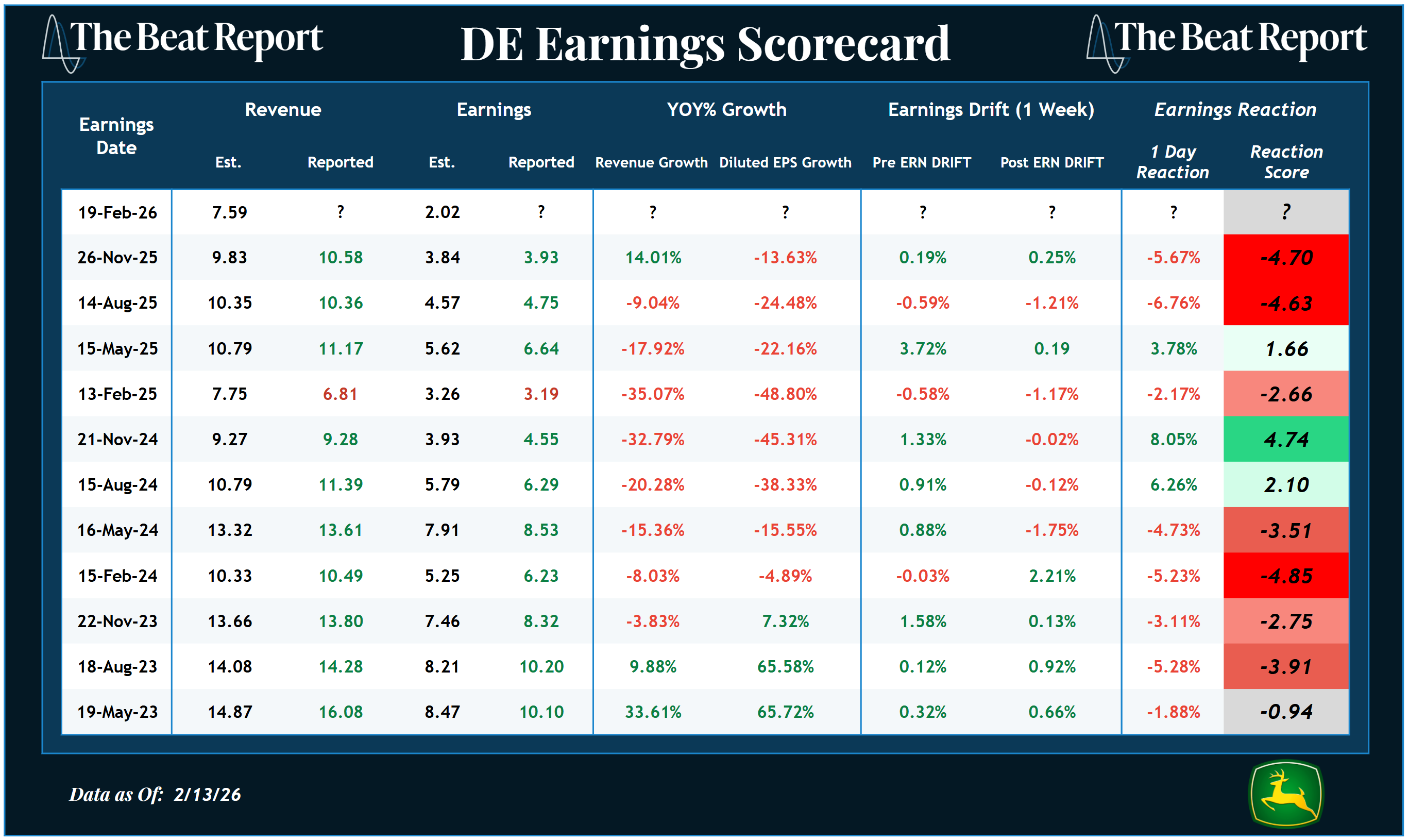 Deere has been punished for two consecutive earnings reports.