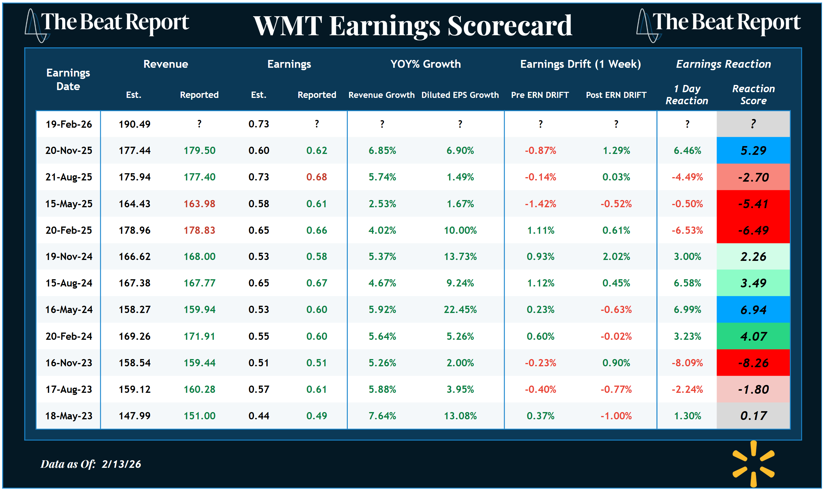 Last quarter, Walmart snapped a three-quarter streak of negative earnings reactions with a +6.46% move and positive post-earnings drift.