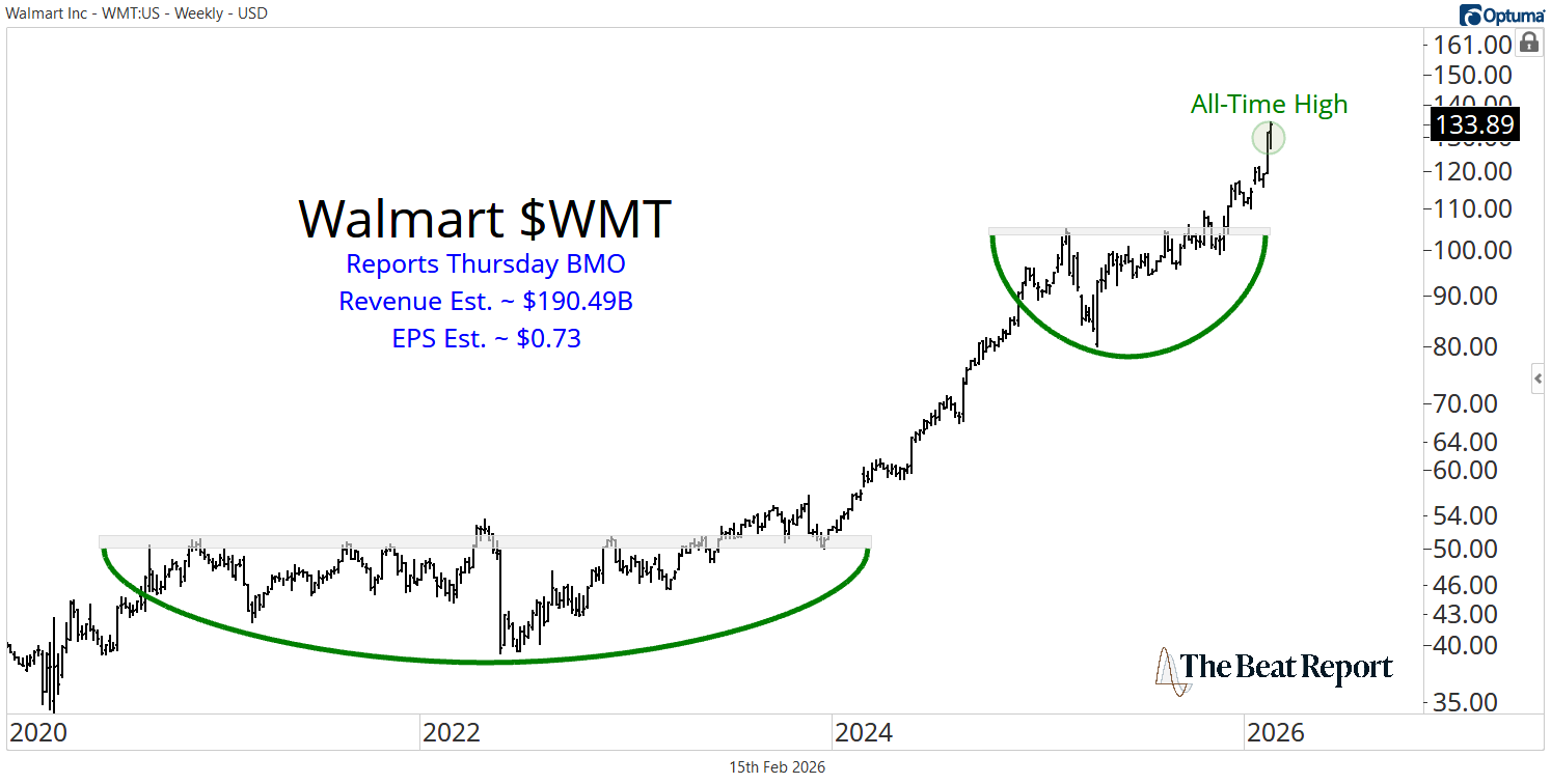 Walmart has been in a powerful primary uptrend for years. After carving out a textbook accumulation pattern for most of 2025, the stock broke out in Q4 and has been ripping to fresh all-time highs ever since.