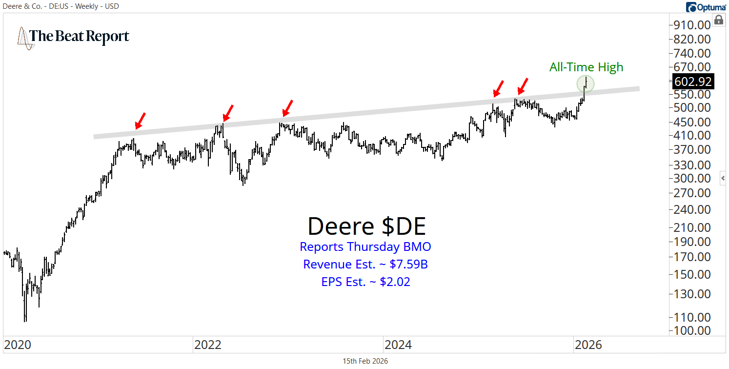 Deere $DE also reports Thursday before the open, with expectations for $7.59B in revenue and $2.02 in earnings per share.