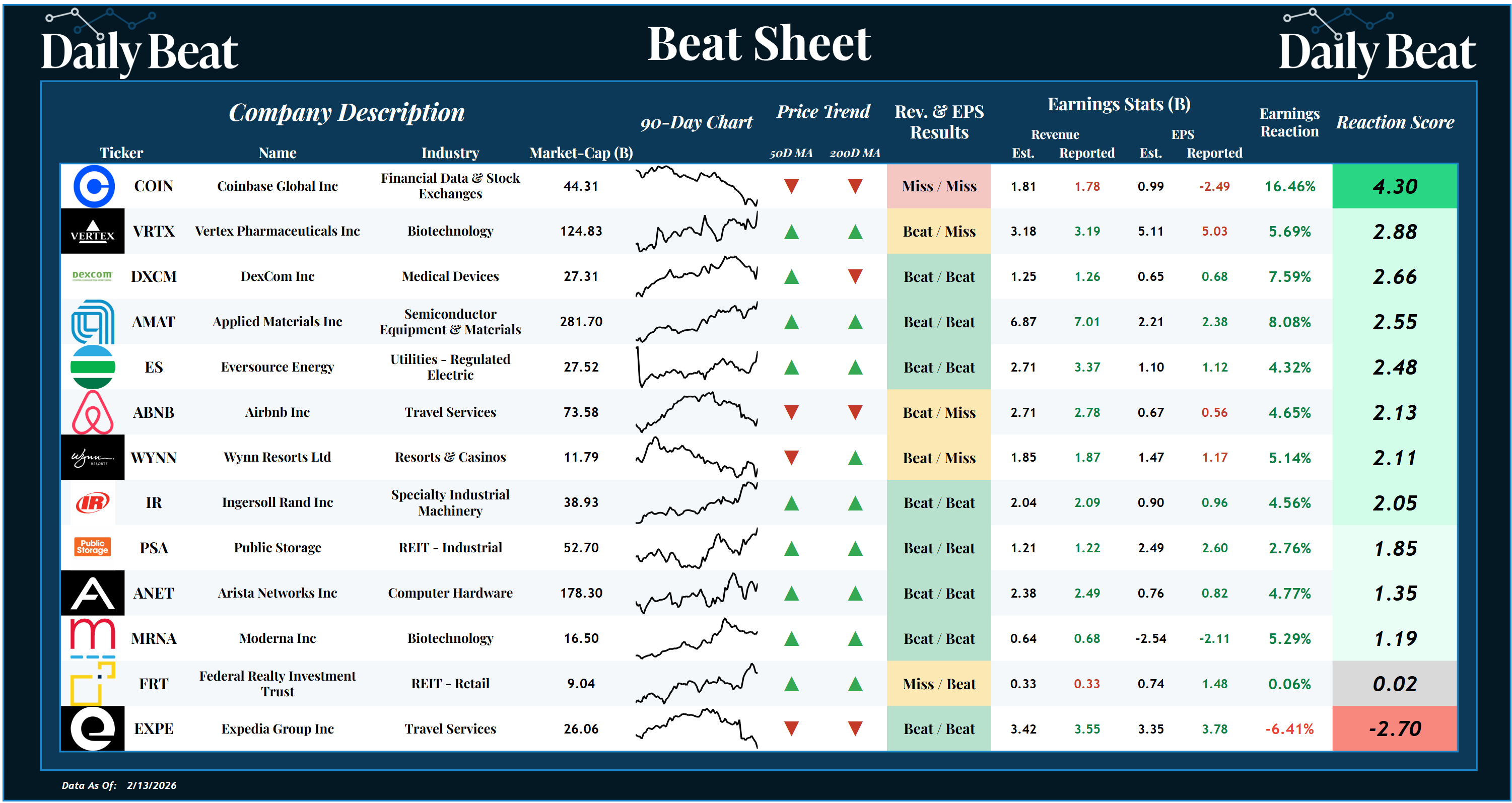At the top of Friday's Beat Sheet was the $44B crypto brokerage platform, Coinbase $COIN. Despite missing expectations across the board, shareholders were rewarded with a +4.30 reaction score.