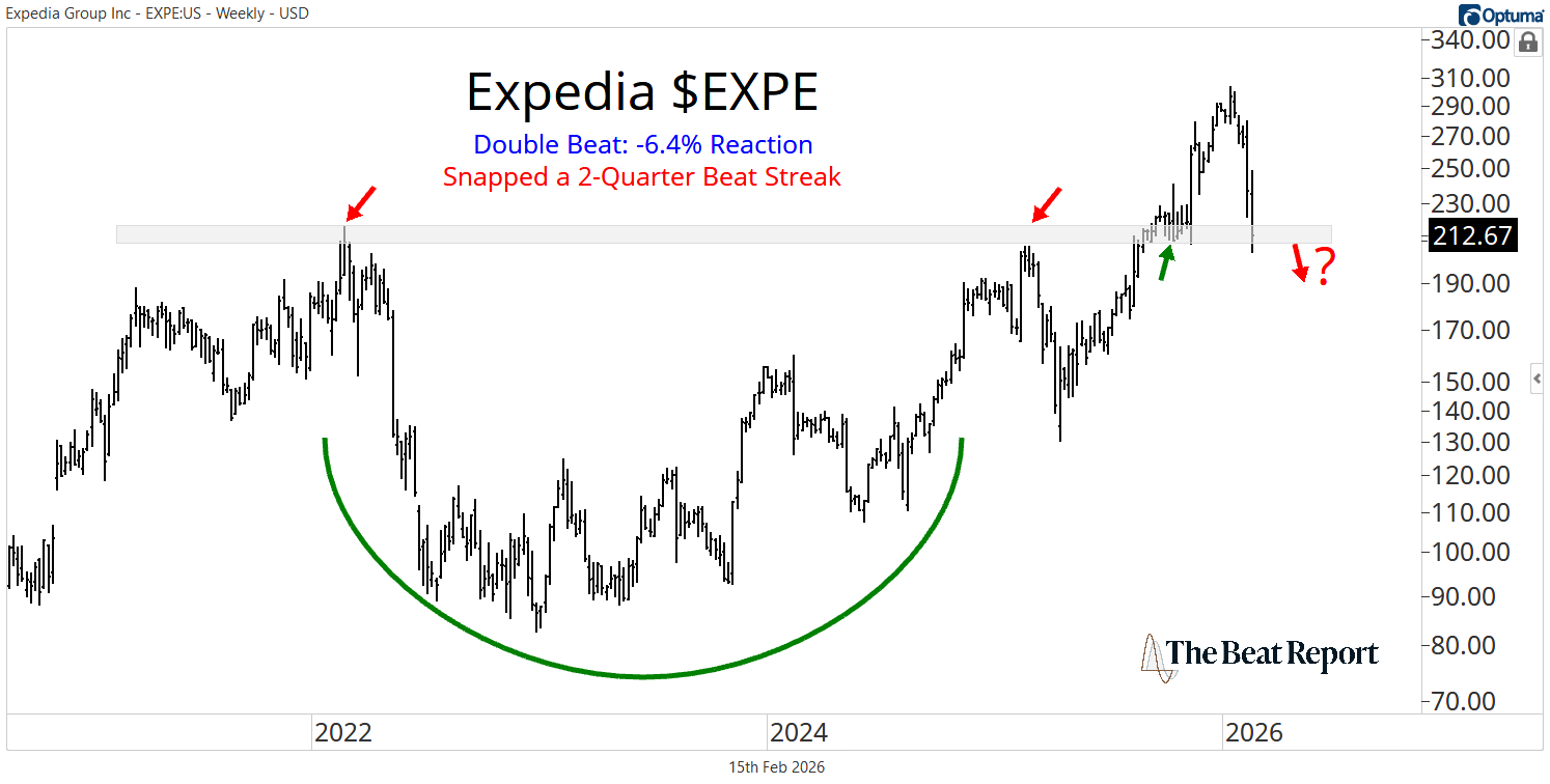 At the bottom of Friday's list was the $26B travel services stock, Expedia $EXPE. Following a double beat, shareholders were punished with a -2.70 reaction score.