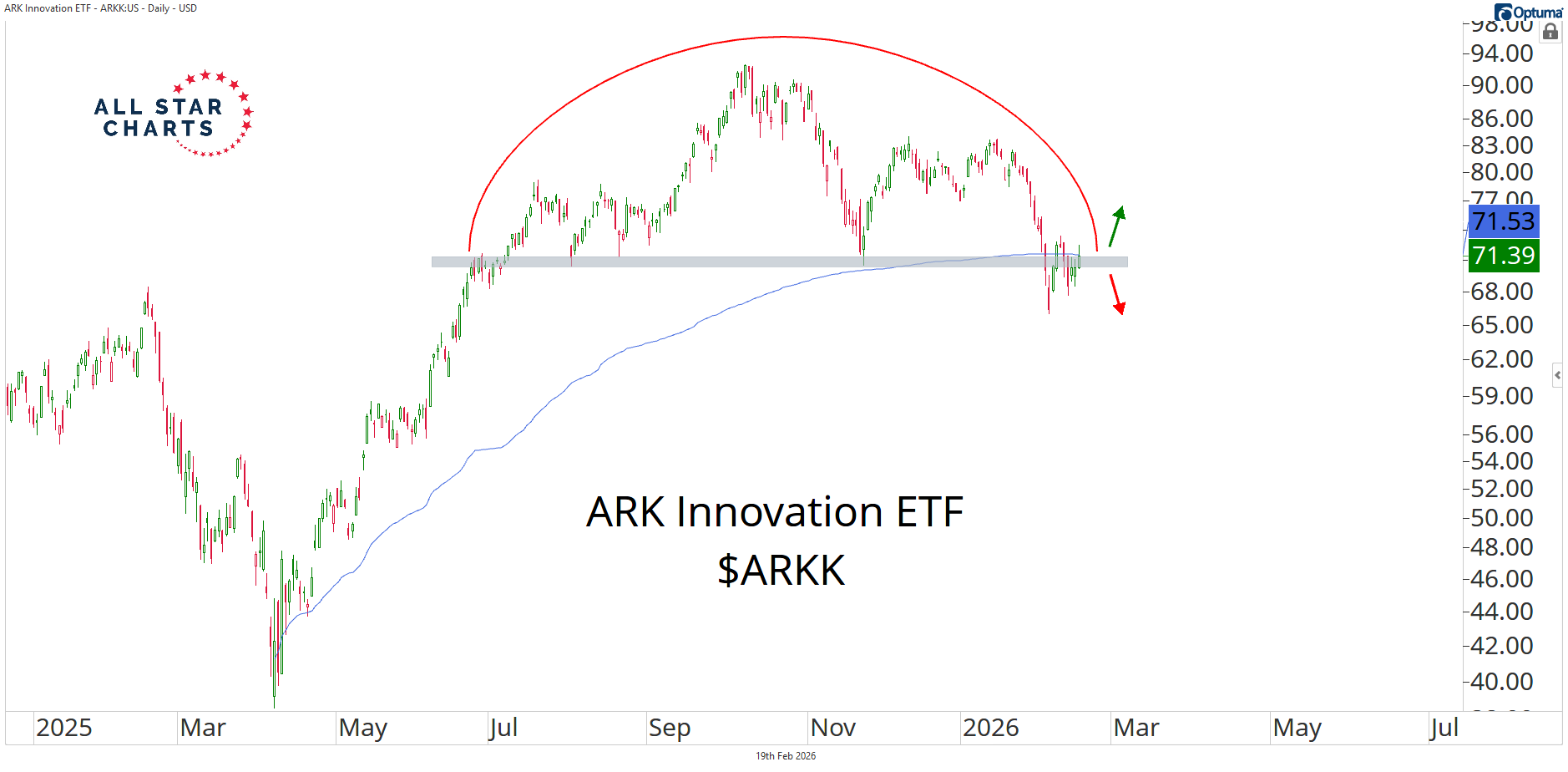 As capital continues rotating out of growth and into cyclicals, the ARK complex is approaching a critical test.