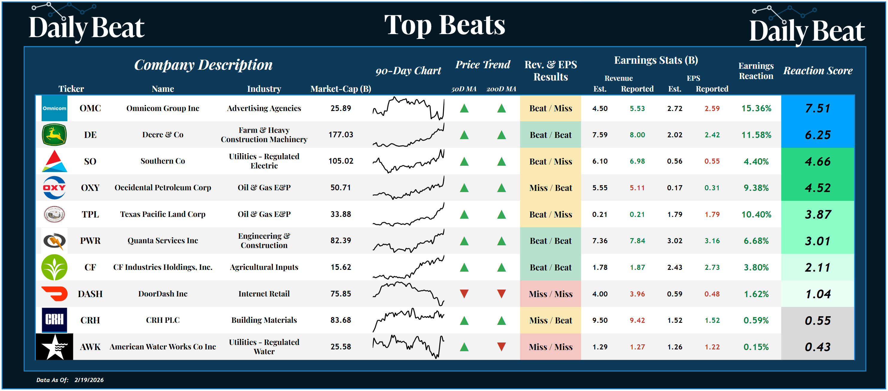 Thursday's top beat came from the $26B advertising agency, Omnicom $OMC. After posting mixed headline results, shareholders were rewarded with a +7.51 reaction score.