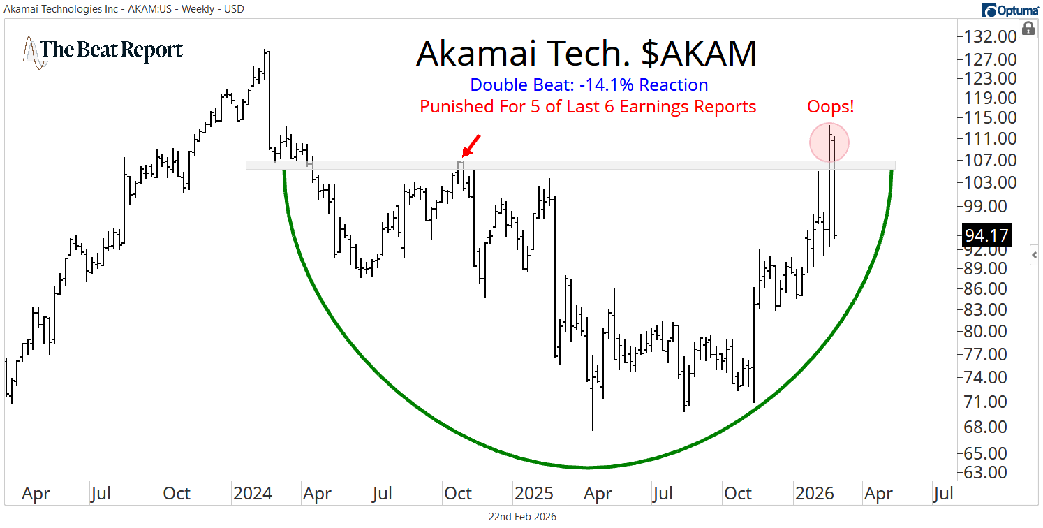 At the bottom of Friday's list was the $13B software stock, Akamai Tech. $AKAM. Following a double beat, shareholders received a -6.64 reaction score.