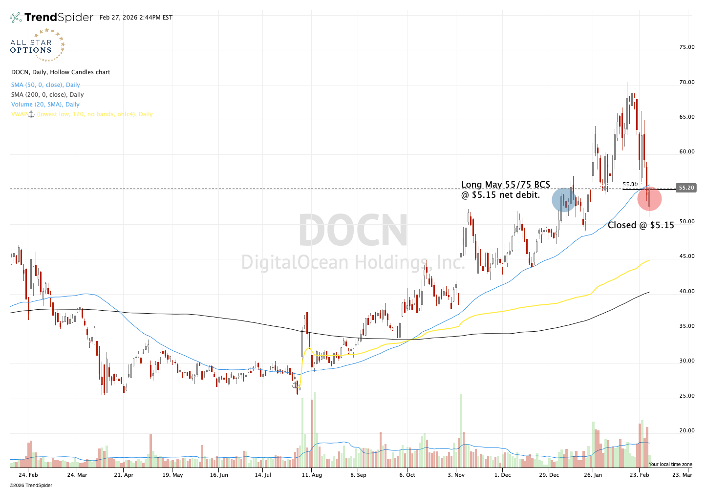I've been in a May bull call spread on Digital Ocean $DOCN for 51 days. I entered on January 7th, paying $5.15 for the spread when the stock was trading around $54. Today — 51 days later — the stock was again trading right around $54 and I decided to exit because it had dropped below my updated stop level at $55. When I got my fill, I looked at the price and had to do a double take.