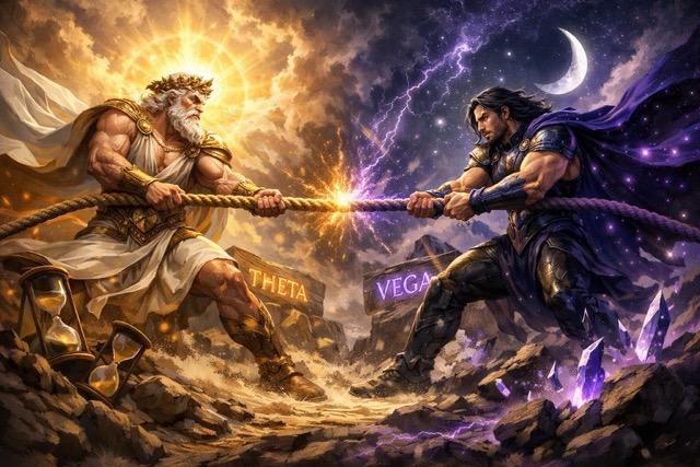Think about it this way: theta was quietly taking money out of my pocket every single day for 51 days. But vega was quietly putting money back in. And in this case, they happened to perfectly cancel each other out. It's like two tug-of-war teams pulling with the exact same force — nobody moves.