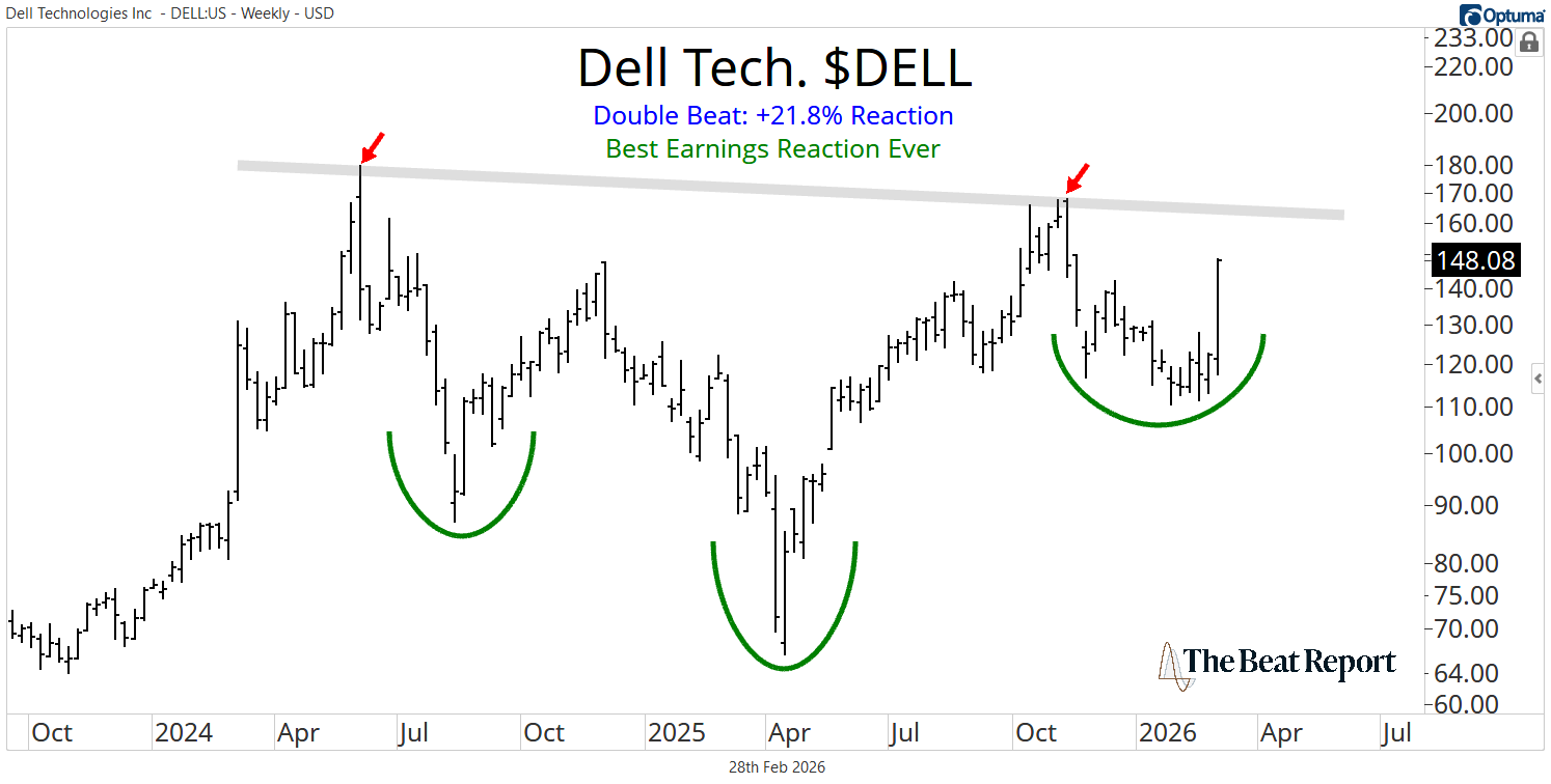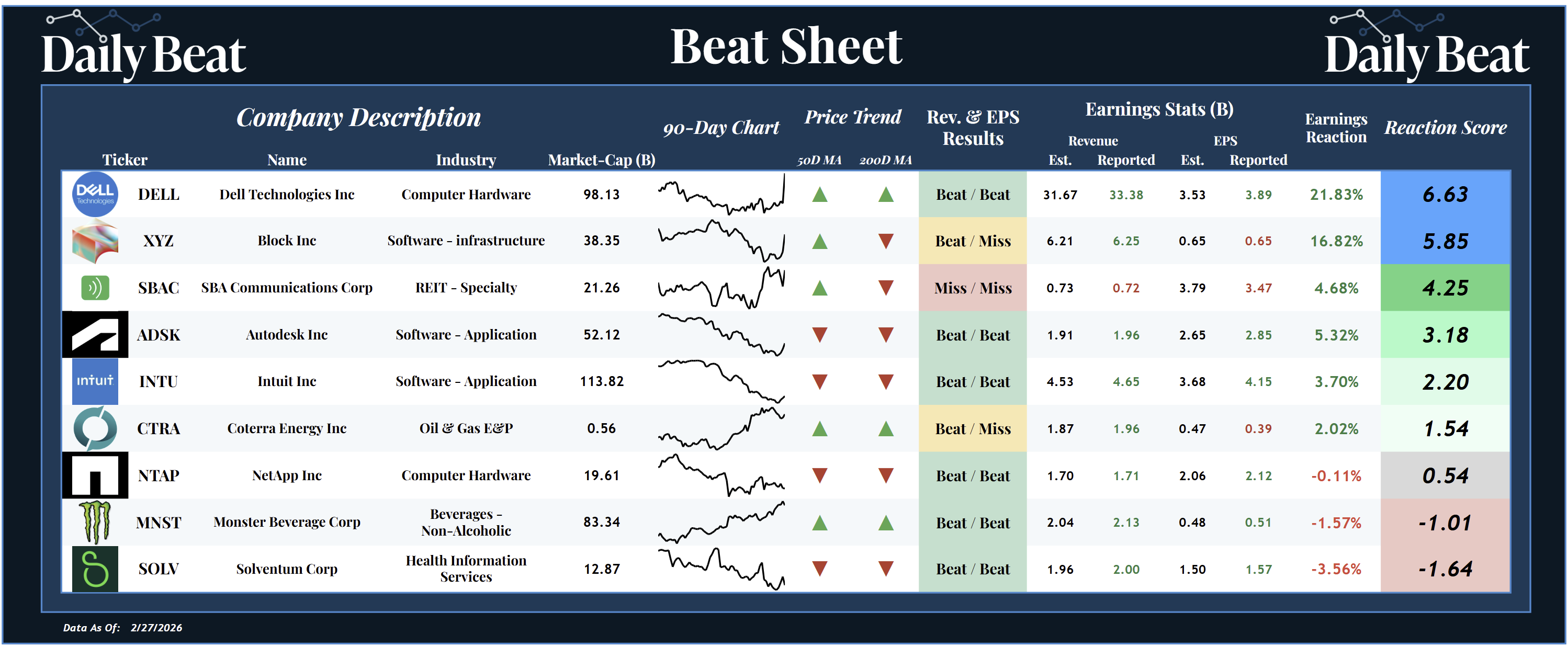At the top of Friday's Beat Sheet was the $98B computer hardware stock, Dell Technologies $DELL. Following a big double beat, shareholders were rewarded with a +6.63 reaction score.