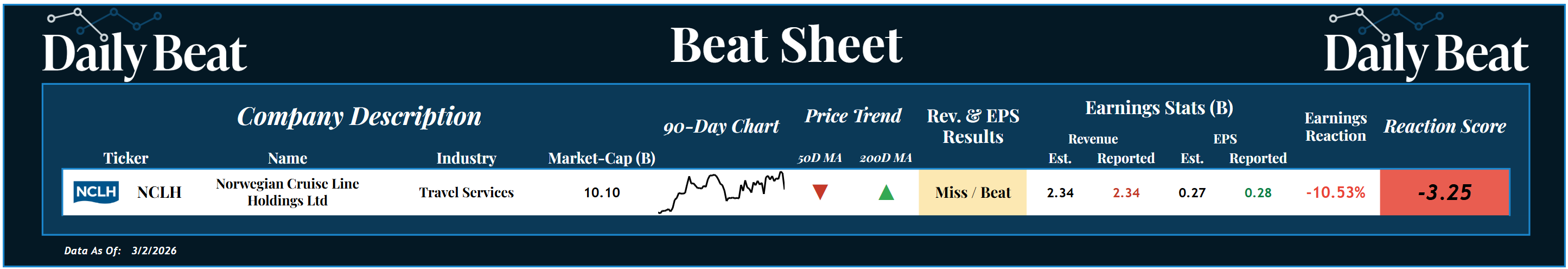 Monday's only beat came from the $10B travel services stock, Norwegian Cruise Line $NCLH. Following a mixed earnings report, shareholders suffered a -3.25 reaction score.