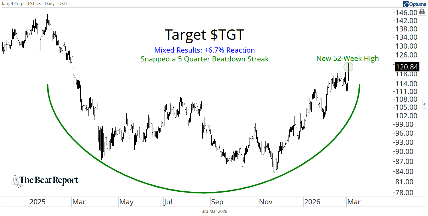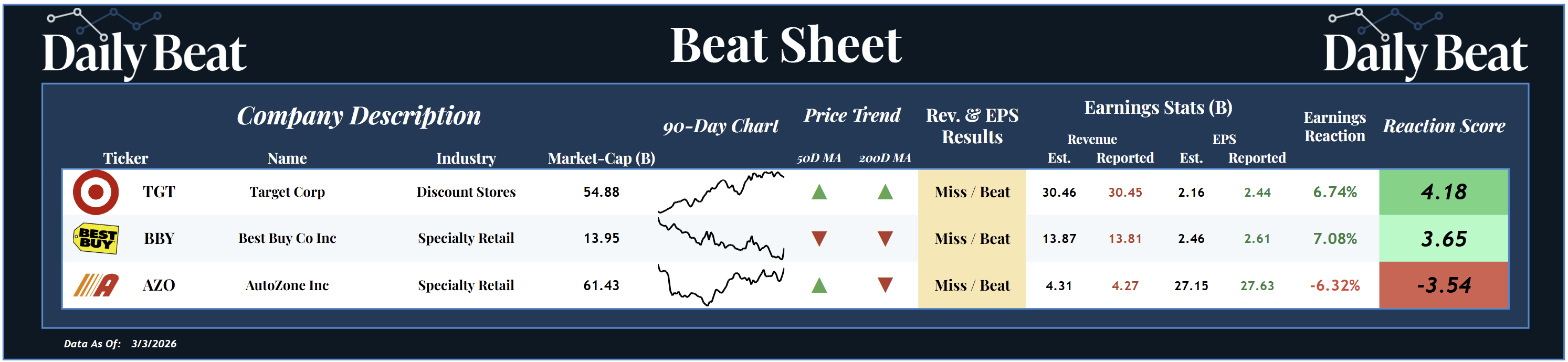 At the top of Tuesday's Beat Sheet was the $55B discount store stock, Target $TGT. Following a mixed earnings report, shareholders were rewarded with a +4.18 reaction score.