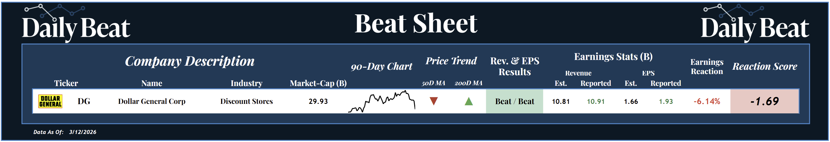 While Dollar General beat expectations on both revenue and earnings per share, shareholders were not impressed, sending the stock down -6.1% in reaction to the report. This resulted in a -1.69 reaction score.