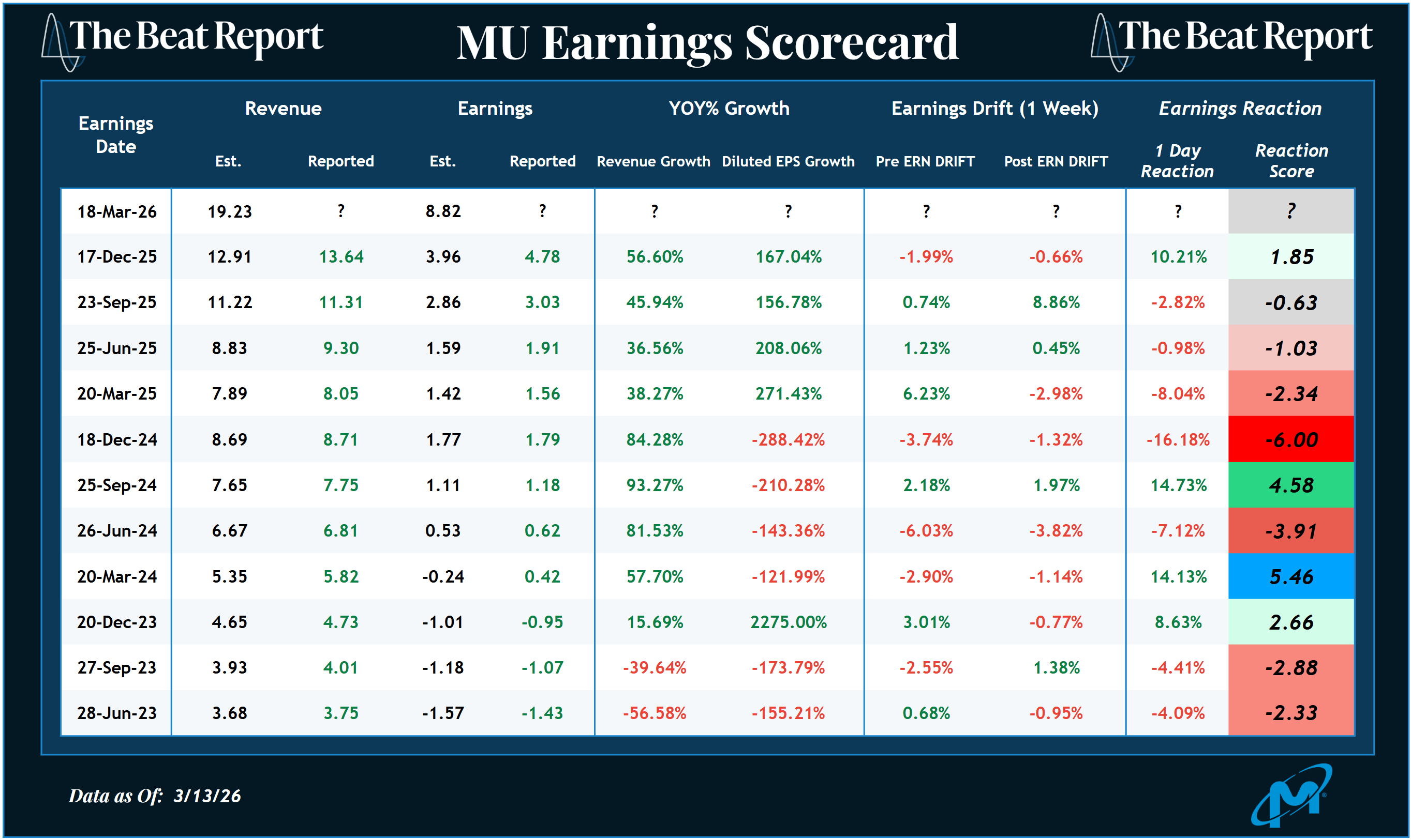 Last quarter, Micron snapped a streak of four consecutive negative earnings reactions. That shift helped confirm the broader technical breakout that was already underway.