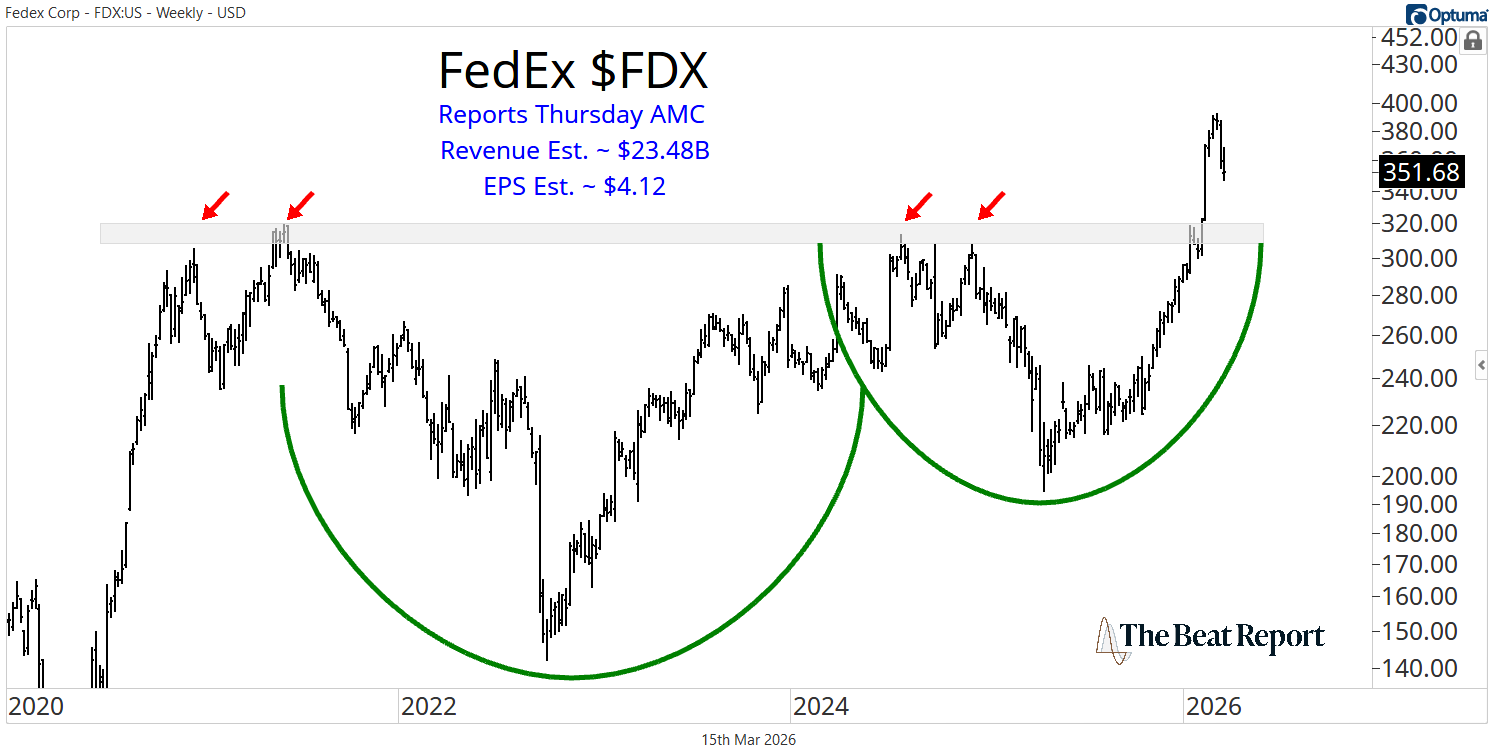 Finally, let’s take a look at FedEx $FDX, which reports after the close on Thursday. Investors are expecting about $23.48B in revenue and $4.12 in EPS.
