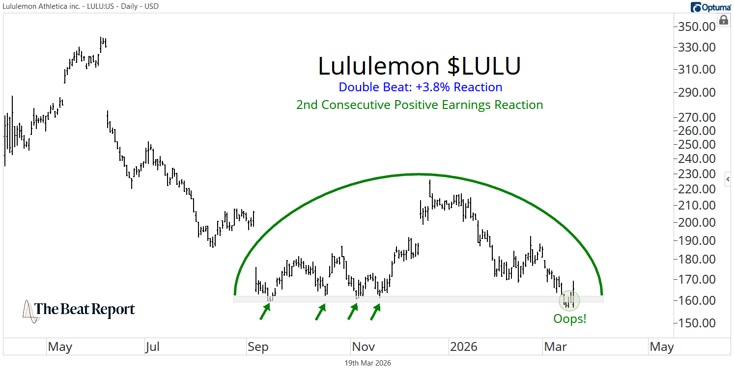 Lululemon $LULU led the board with the strongest reaction and reaction score, rallying +3.8% after a clean double beat. That marks its second consecutive positive earnings reaction.
