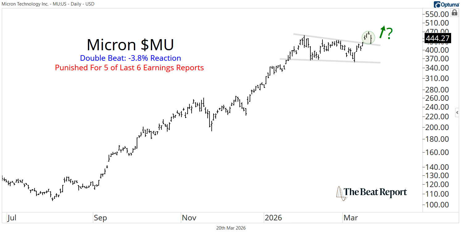 Meanwhile, Micron $MU also reported a double beat… but fell -3.8%, marking its fifth negative earnings reaction in the last six reports.