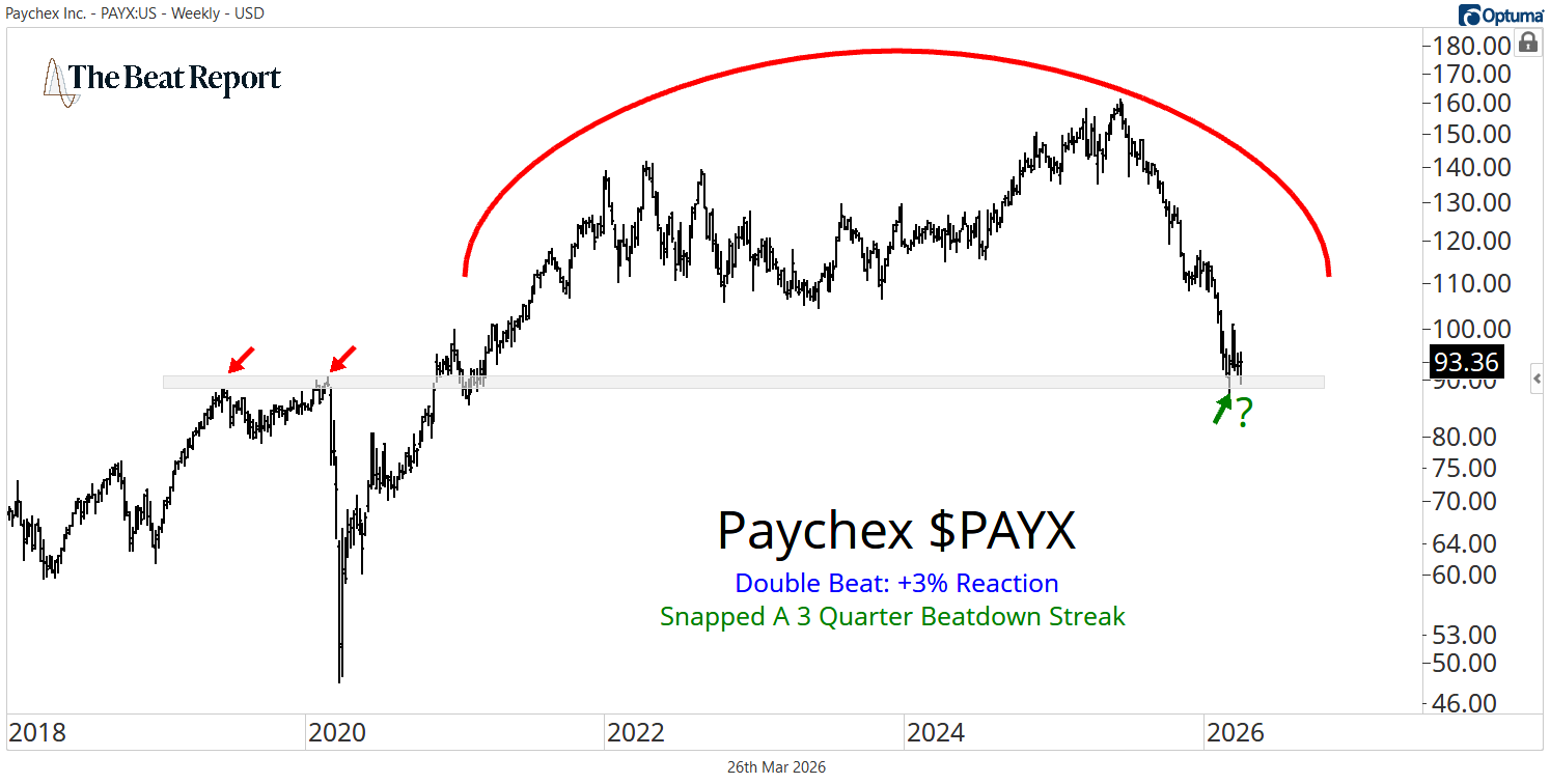 Paychex was the clear winner. The stock gained about 3% on the report, earning the strongest reaction score of the day and snapping a three-quarter beatdown streak.