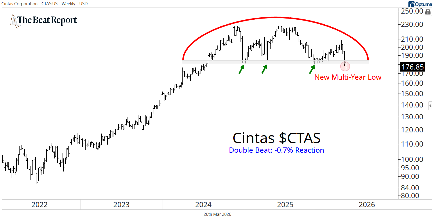 Cintas has spent the past few years building a large topping structure, with repeated failures near the highs and a clear shift from accumulation to distribution over time. And now, that process is resolving lower.