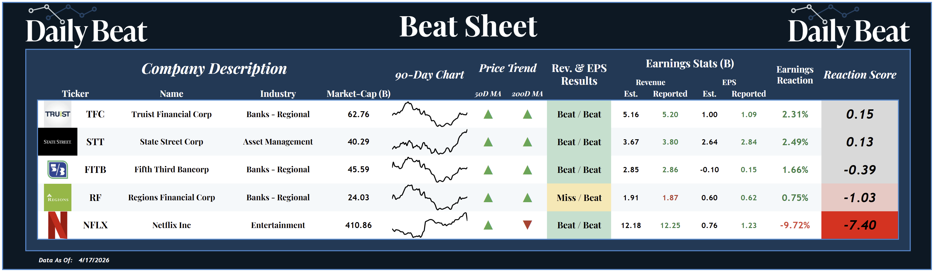 We saw four financials post positive earnings results, but once you strip out the tailwind from the index rally, two of those quickly fall apart. That’s exactly what our reaction score framework is designed to capture.