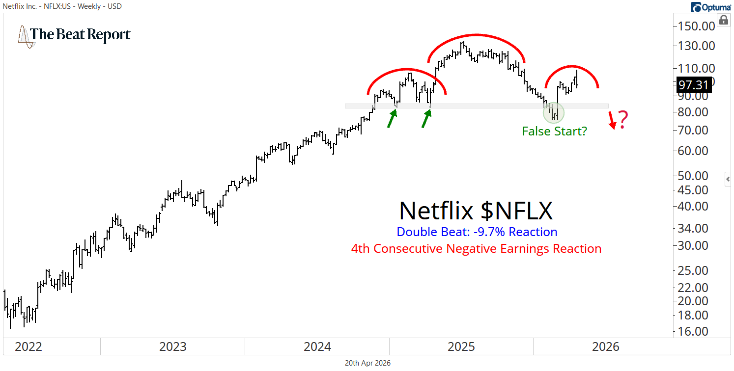 At the same time, Netflix $NFLX delivered a clean double beat… and got absolutely smoked. The stock traded lower by nearly 10% on the day, with a reaction score of -7.4, the worst we’ve seen so far this earnings season.