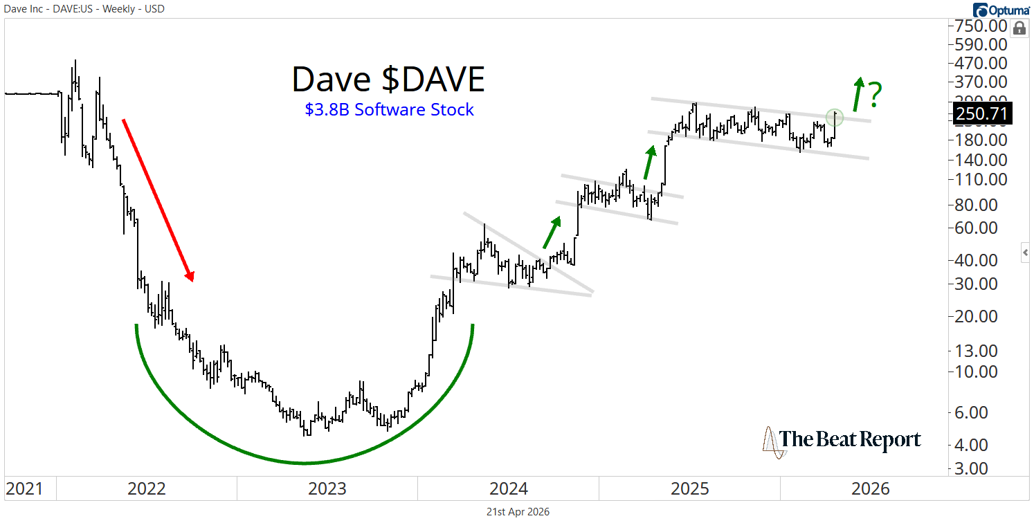 What we’re looking at today is one of the most powerful turnarounds in the entire market. Since bottoming in May of 2023, DAVE has rallied roughly 6,000% in one of the cleanest, most orderly uptrends you’ll find anywhere.