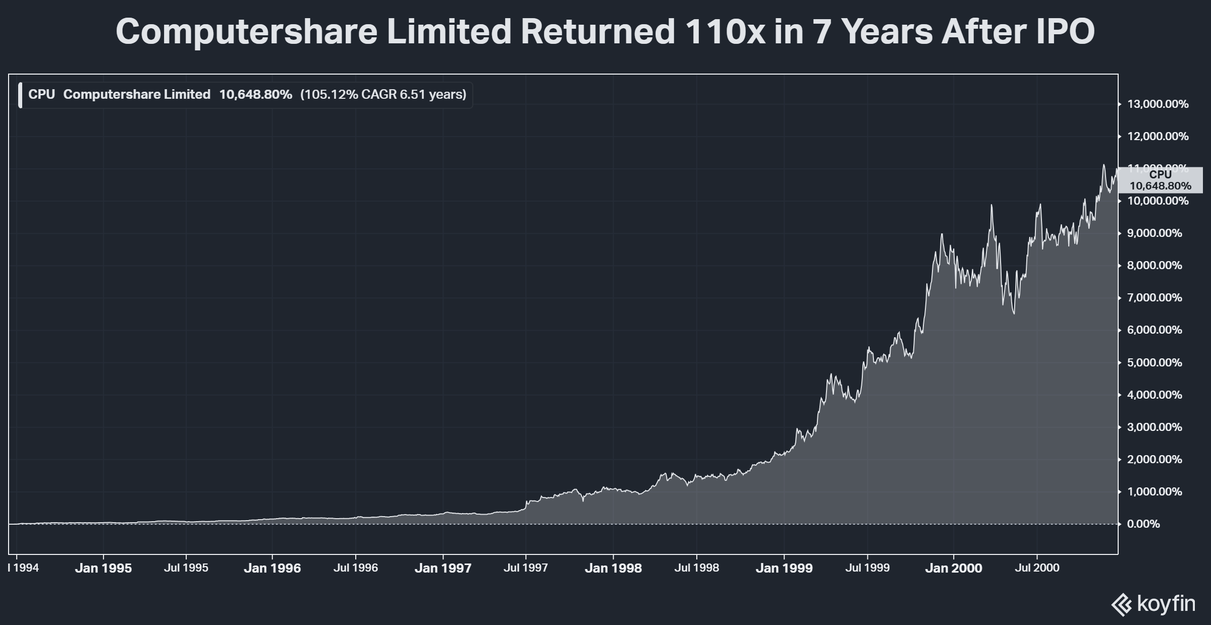 And when Computershare went public on the ASX in 1994, it did something almost no company in modern market history has done: it returned investors 110x their money in the first seven years alone.
