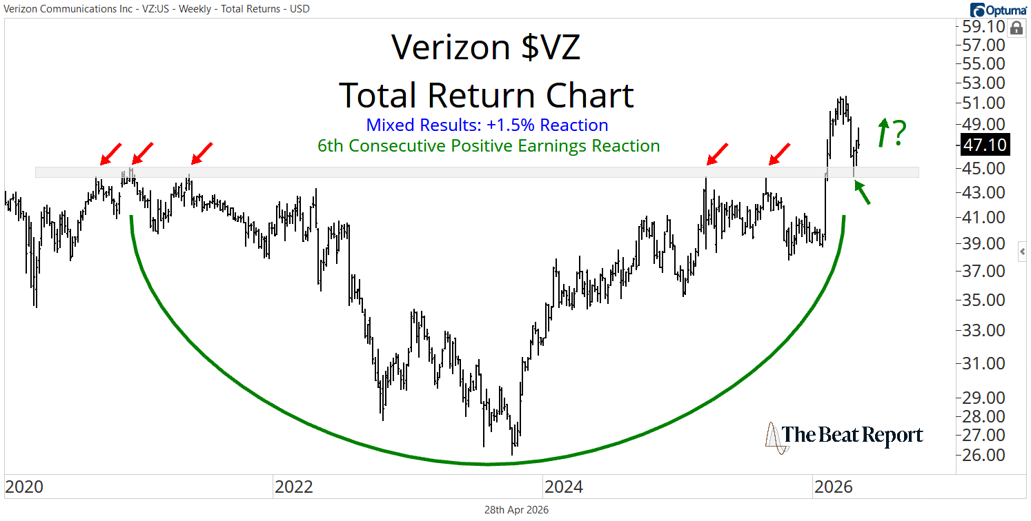 Verizon broke out of a massive multi-year base earlier this year and has since returned to retest that breakout level, flipping former resistance into support.
