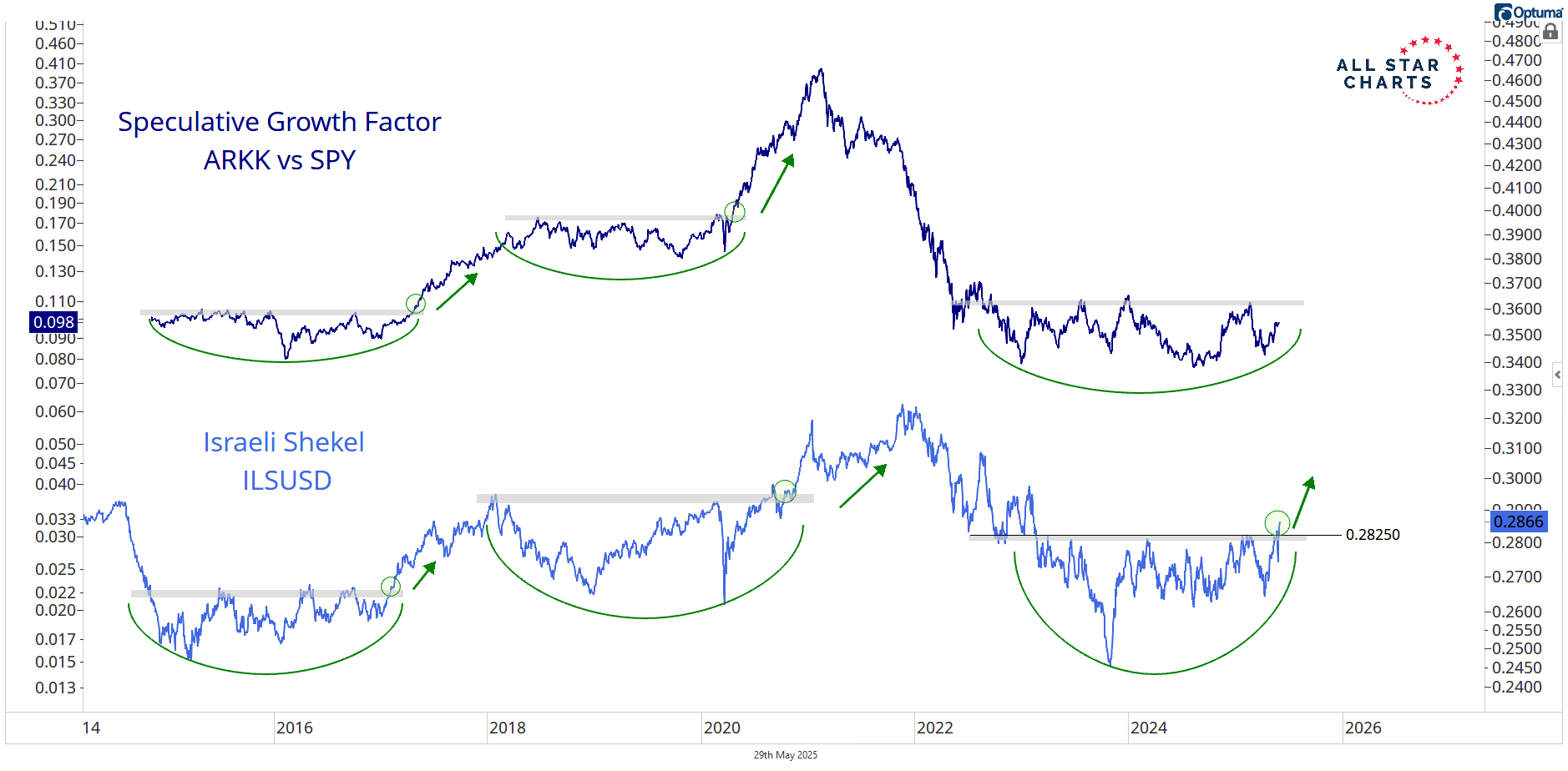 We were diving into global risk indicators, and I was showing how the Shekel is an excellent tell for speculative growth stocks and the “ARKKy” trade.