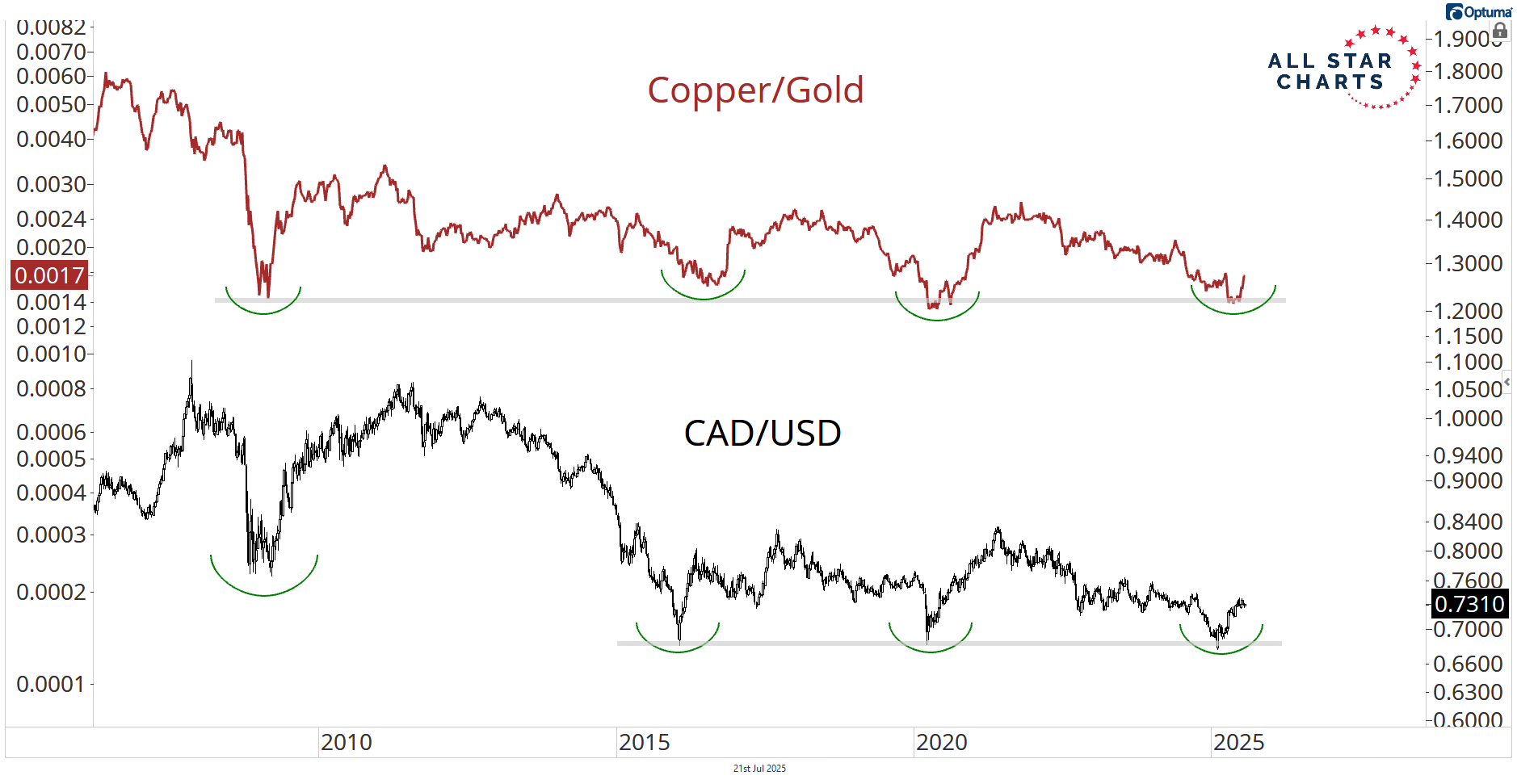 Right now, the Copper/Gold ratio is bottoming, and CAD is confirming the action. It’s been leading the way higher for months now.
