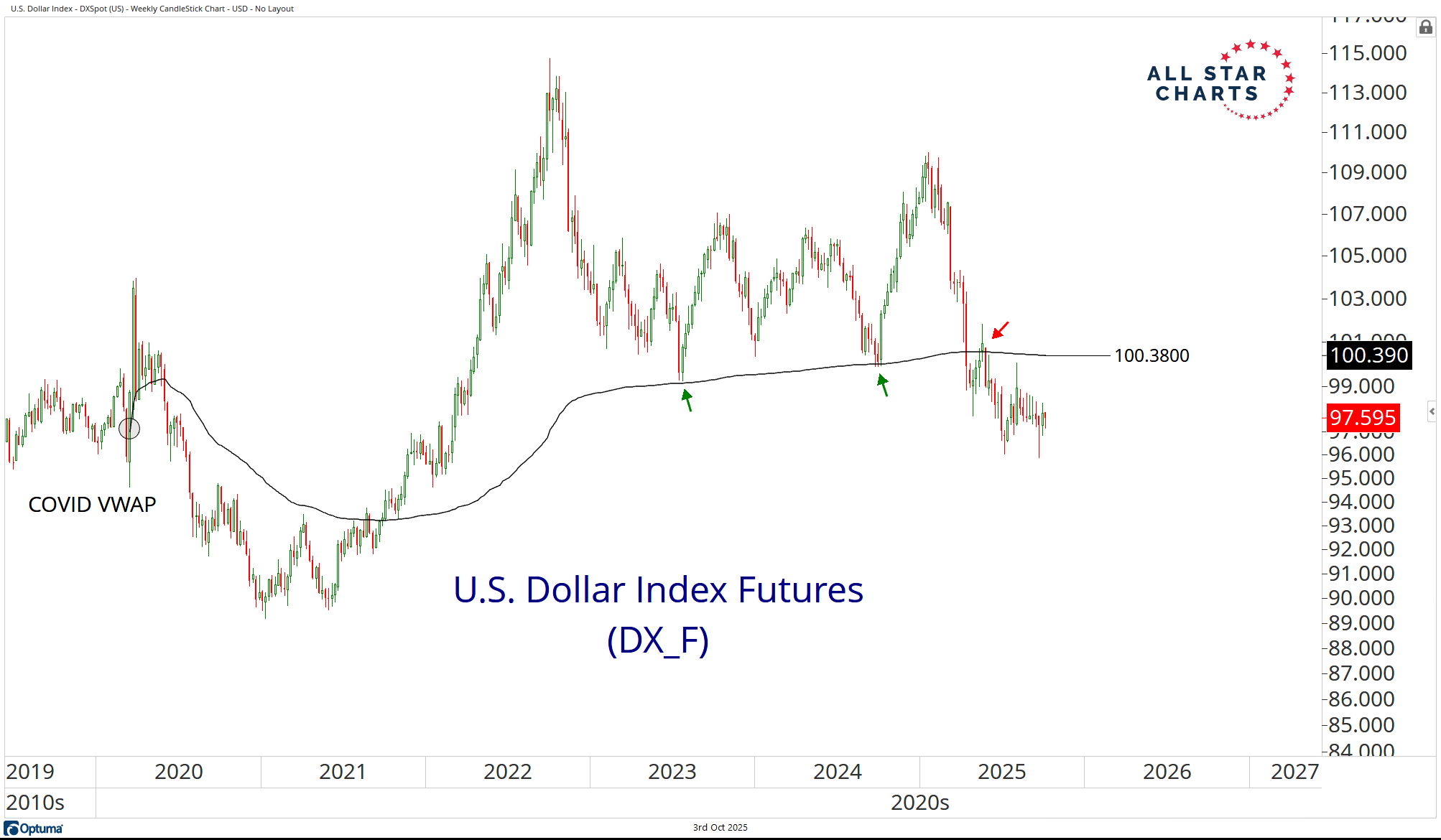 First is 98.20, the May high VWAP. Every rally attempt since has stalled there. Above it, the dollar still has to wrestle with the COVID VWAP near 100.