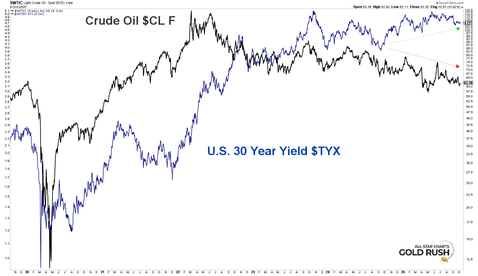 Now look at the second chart: Crude Oil vs. the 30-Year Yield.