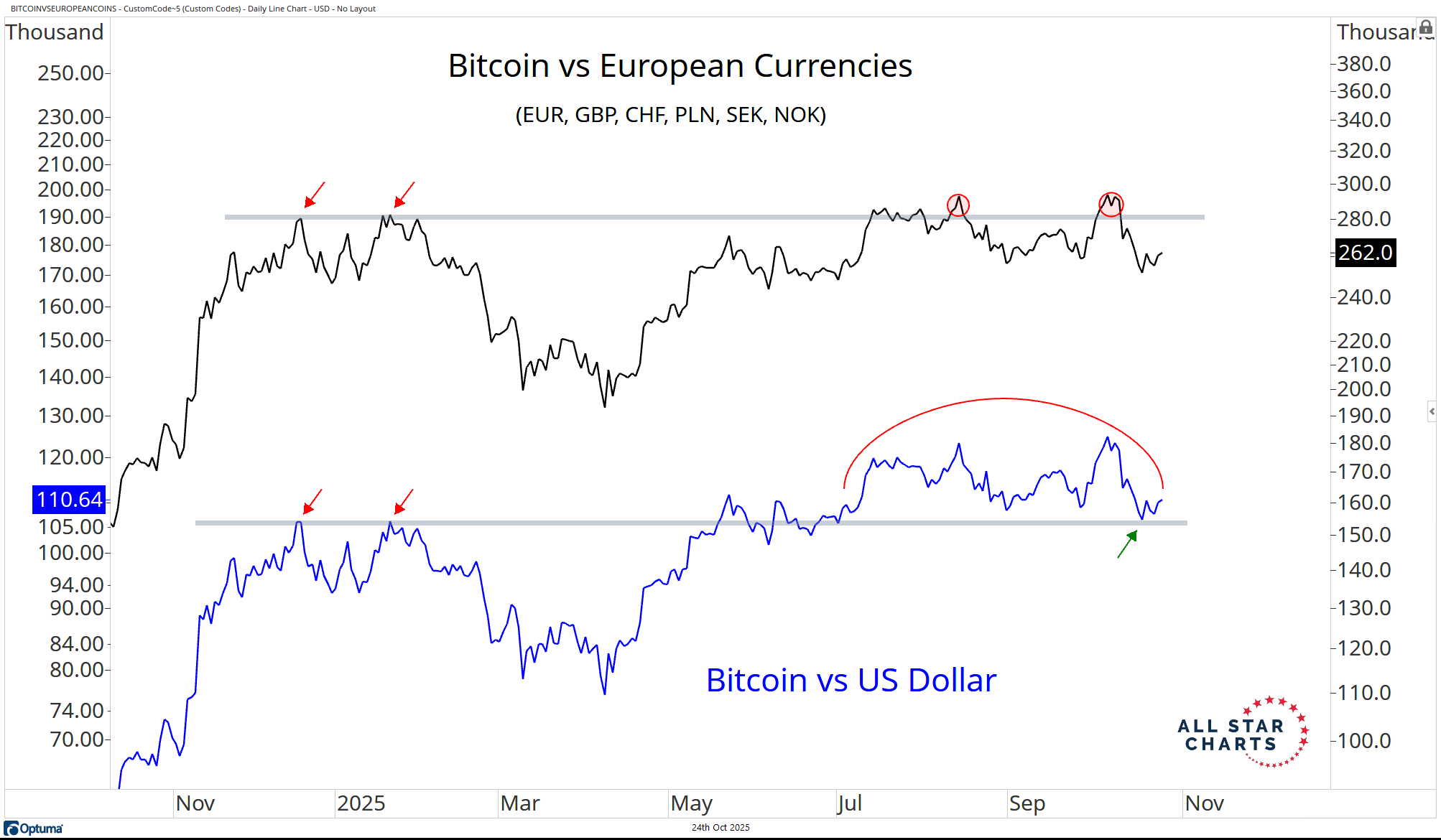 In fact, if we price it in a basket of European currencies, Bitcoin never decisively took out last year’s highs.