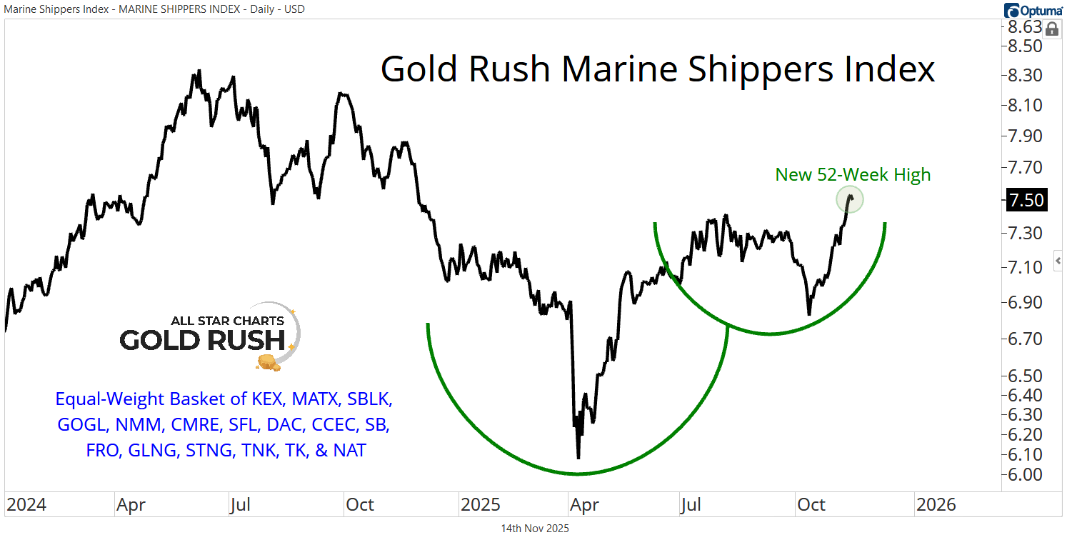 Our Marine Shippers Index - an equal-weight basket of 16 global shippers - is breaking out of a textbook bearish-to-bullish reversal pattern and surging to new 52-week highs.