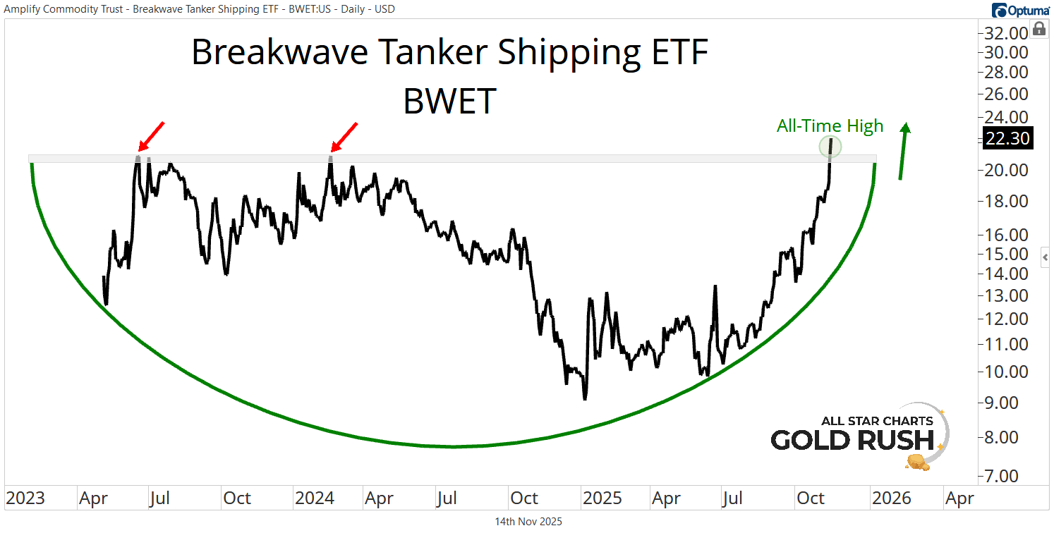 BWET is the first and only ETF that tracks Crude Oil Freight futures, and it's ripping to new all-time highs.