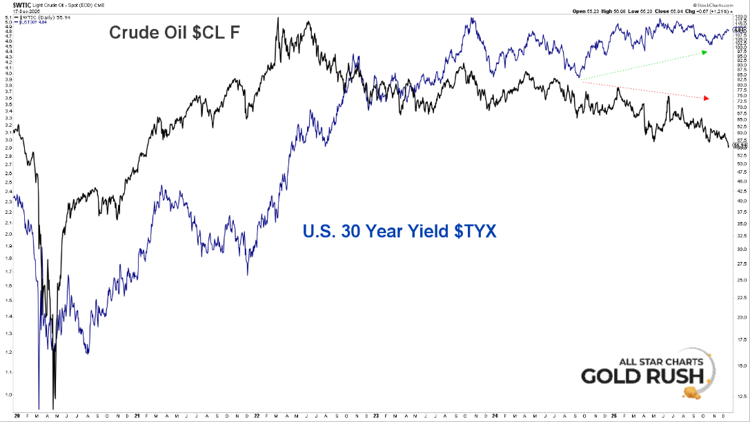 Historically, oil and long-end yields don’t live in completely different worlds. They’re both inflation-sensitive, growth-aware instruments. When they separate like this, it’s usually temporary. One of them eventually catches up to the other.