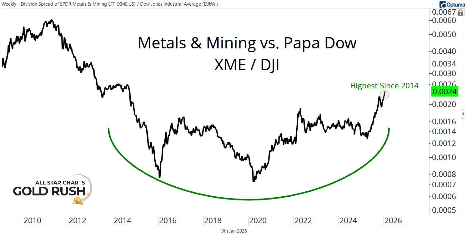 The SPDR Metals & Mining ETF $XME is now trading at its highest level versus the Dow Jones Industrial Average since 2014. That’s more than a decade of relative underperformance being unwound in a matter of months.