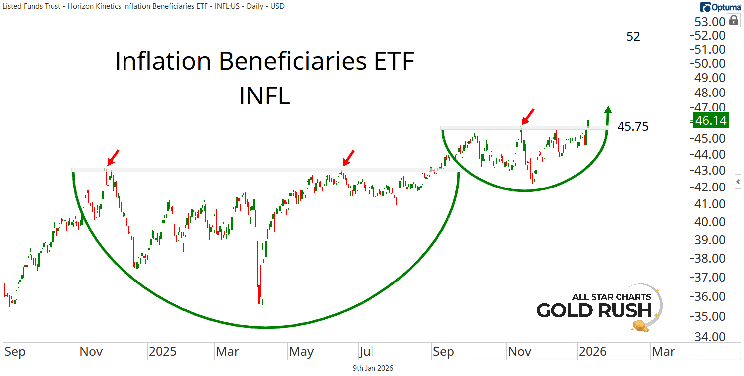 The Horizon Kinetics Inflation Beneficiaries ETF $INFL offers a clean, diversified way to express this theme. The fund is heavily tilted toward areas that historically benefit most from inflationary environments.