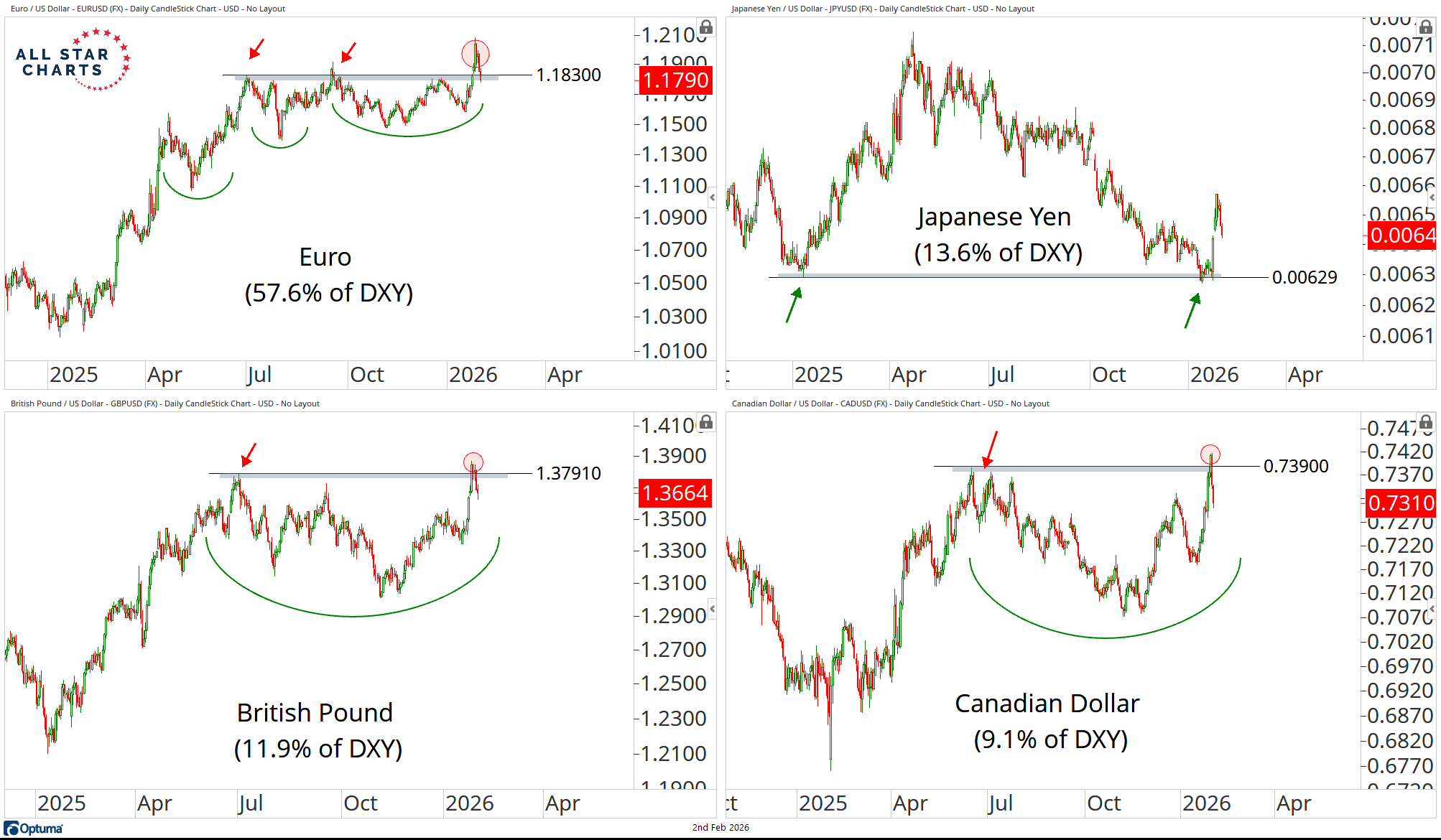The Euro, Japanese Yen, British Pound, and Canadian Dollar collectively make up over 90% of this index.